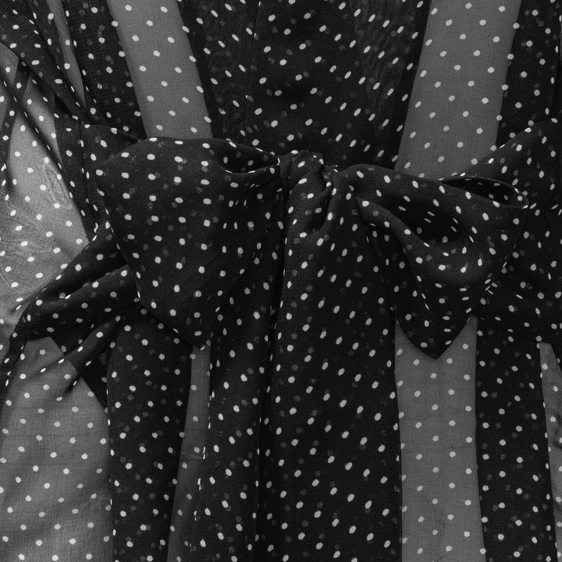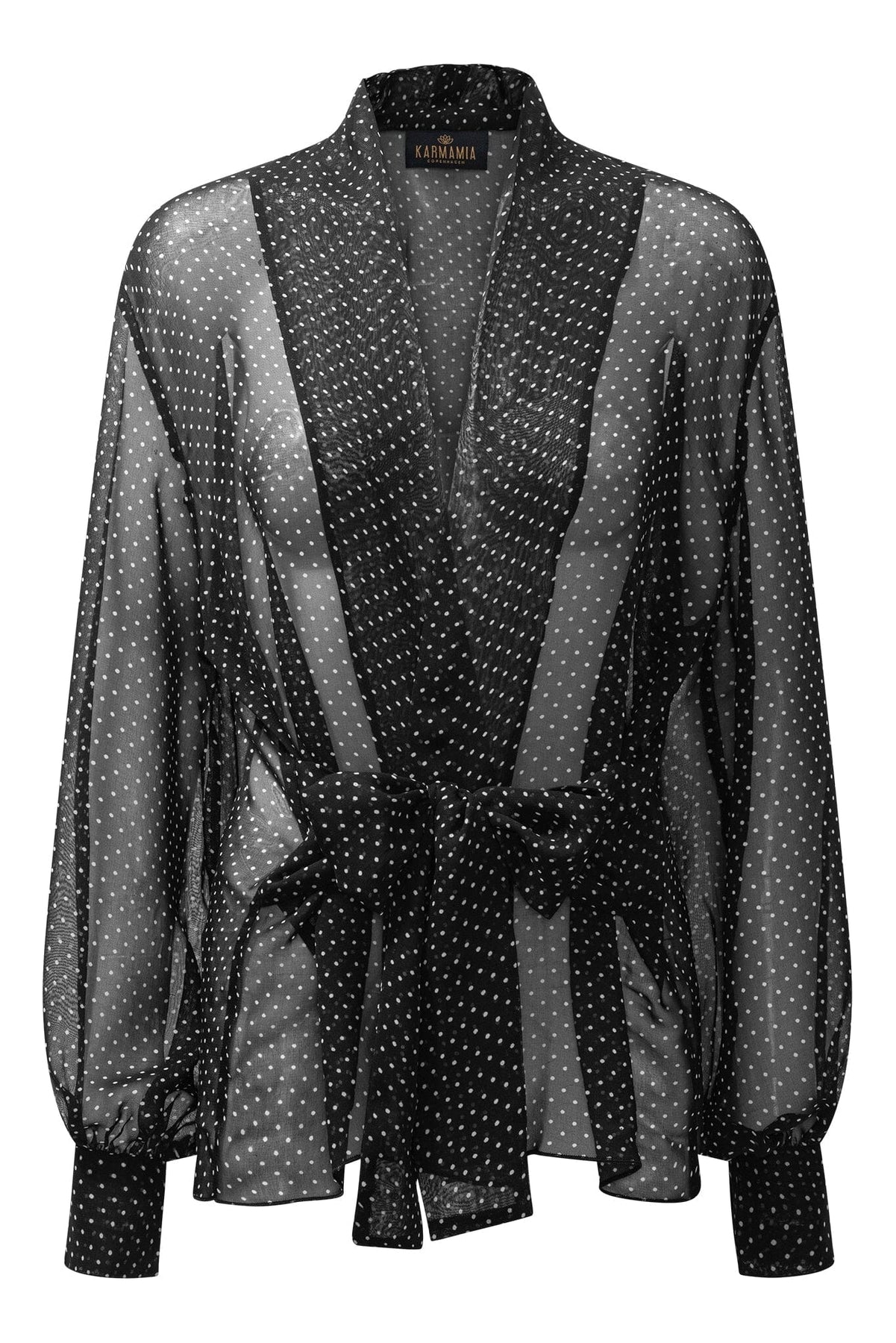 Svart omlottblus från Karmamia med vita prickar. Blusen är gjord av genomskinligt meshmaterial i 100 % polyester och har knytband för stängning.
