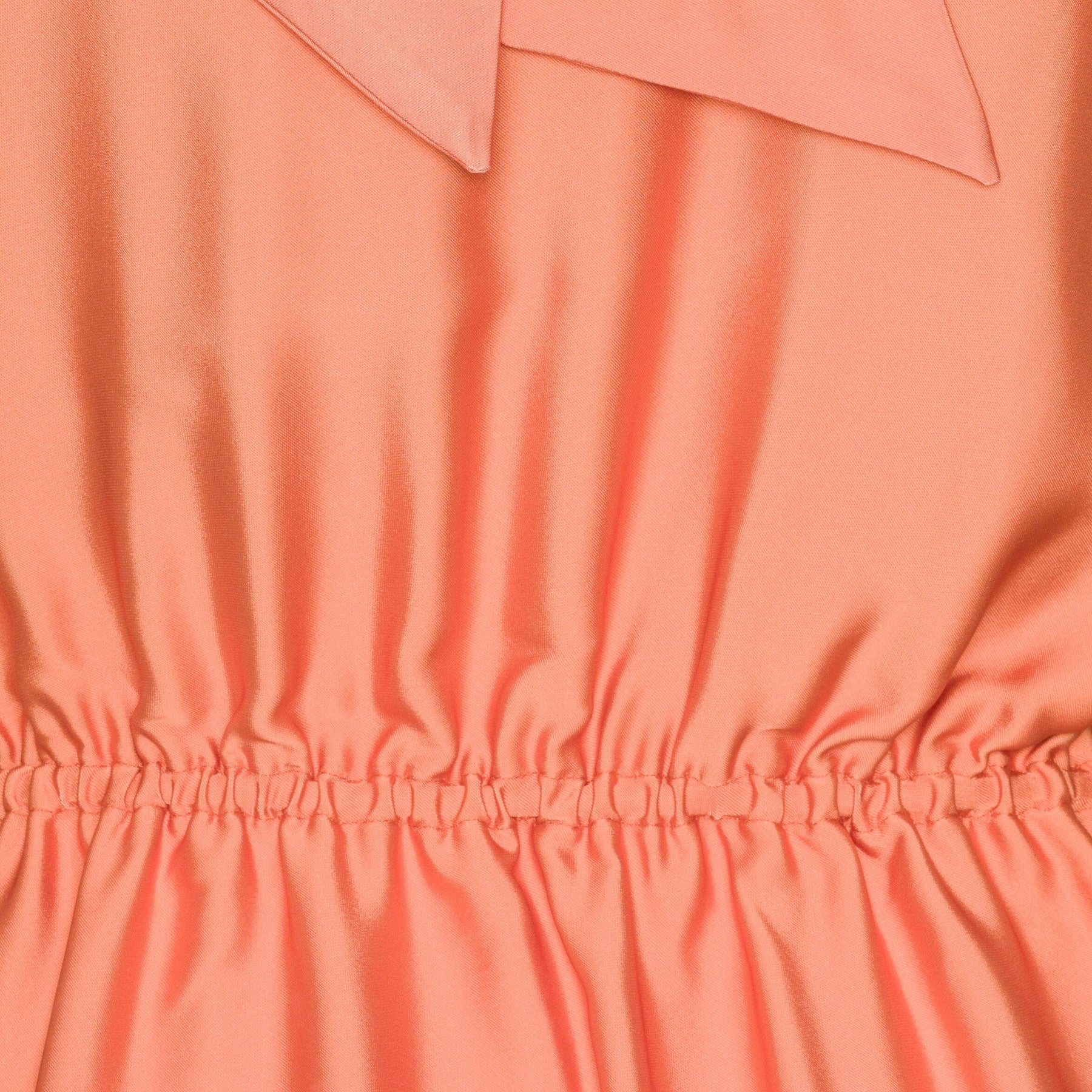 Ankellång klänning från Karmamia med färgövergång från ljus orange till rosa. Klänningen har en hög hals med halterneck och rosett bak. Midjan är samlad med volangdetaljer.