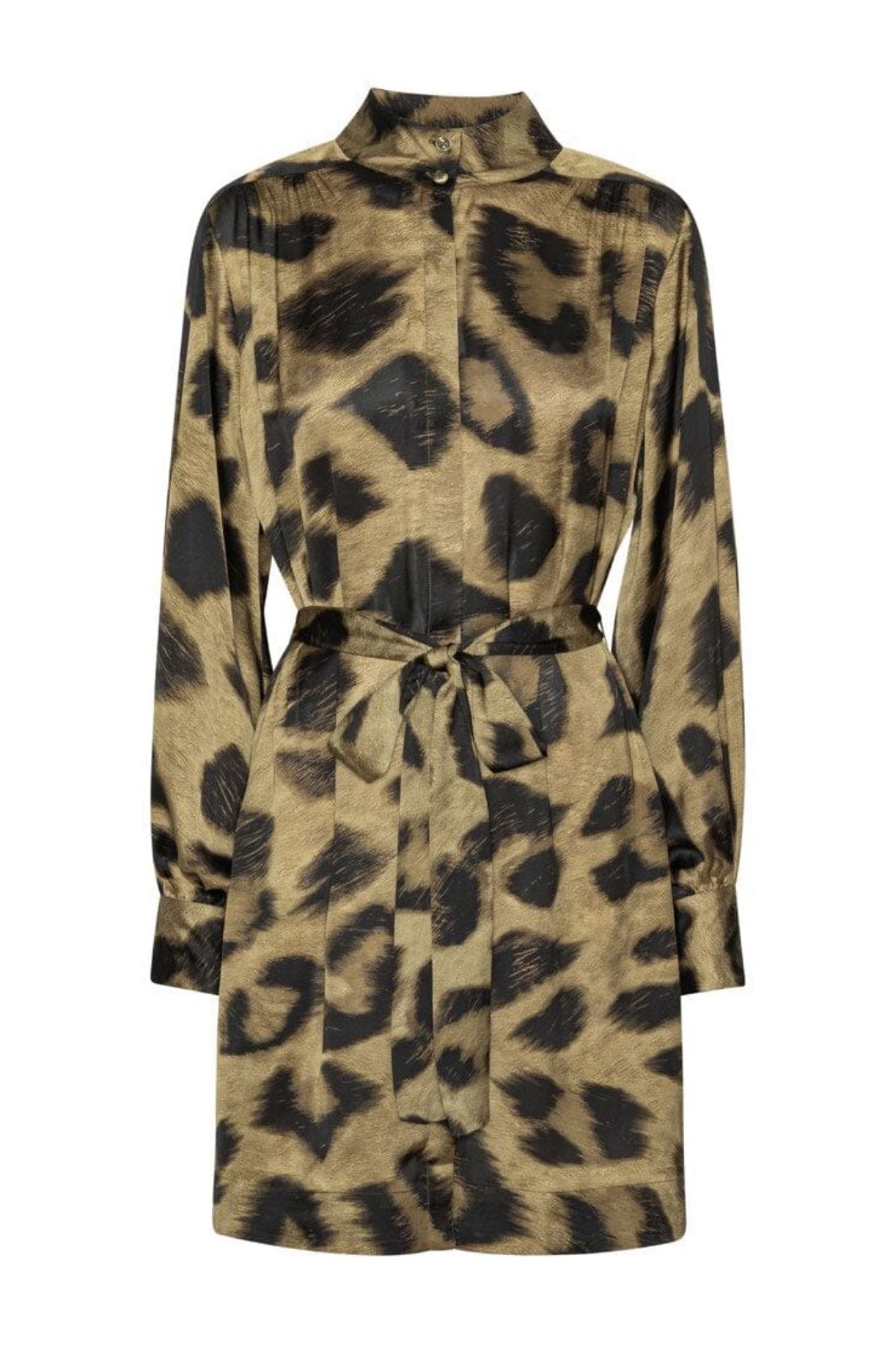 Klänning från Karmamia med leopardmönster i khaki och svart. Den har skjortkrage, långa ärmar och ett bälte i midjan.