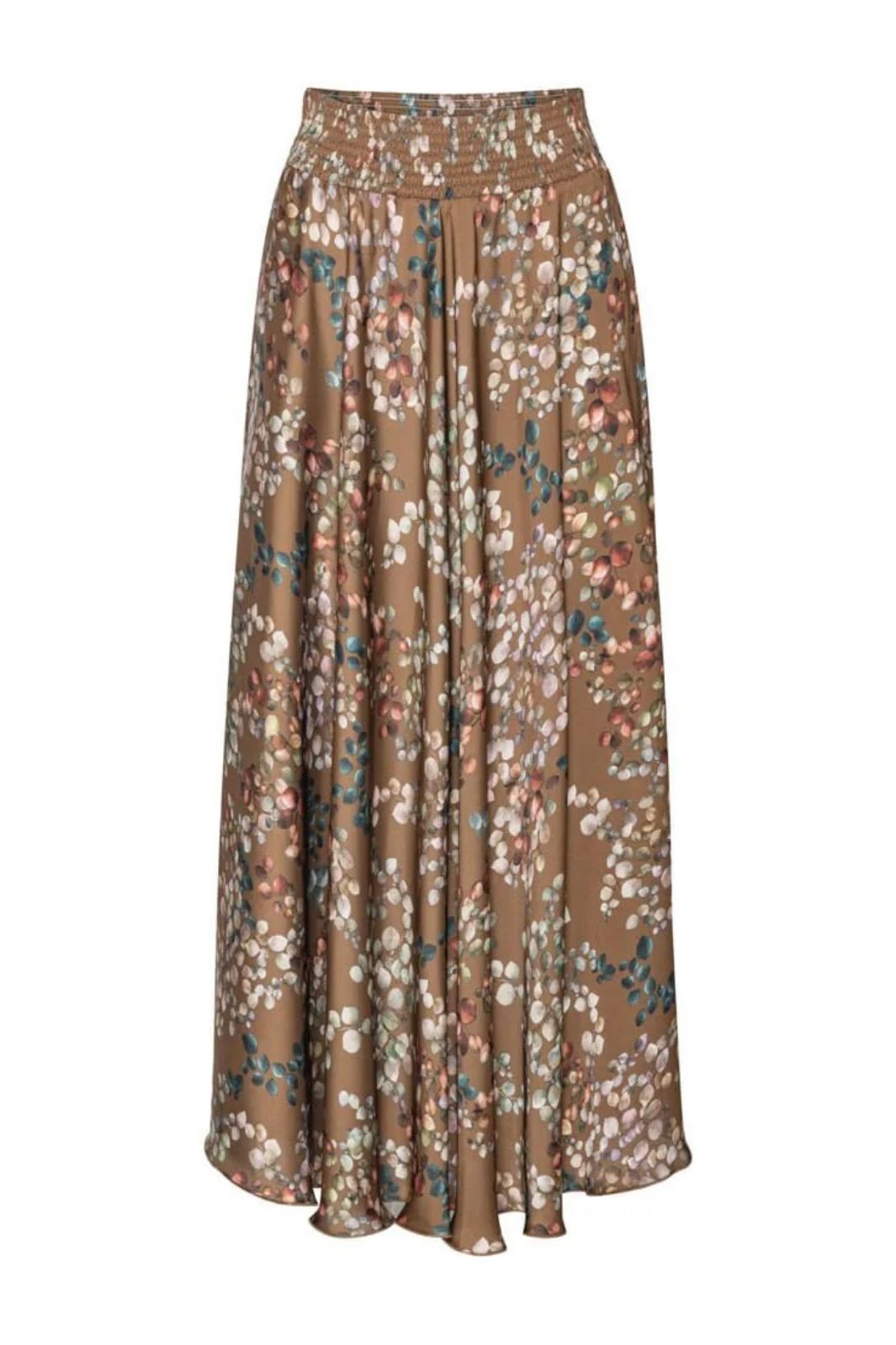 Brun kjol från Karmamia med blommönster i varma nyanser. Tyget har ett mjukt fall med detaljer i rosa, grönt och blått på den bruna bakgrunden.