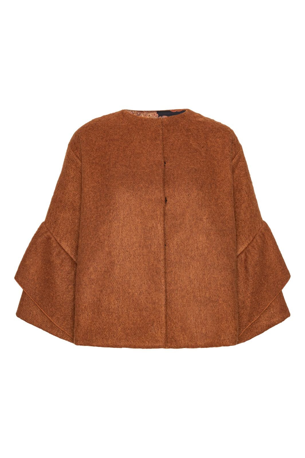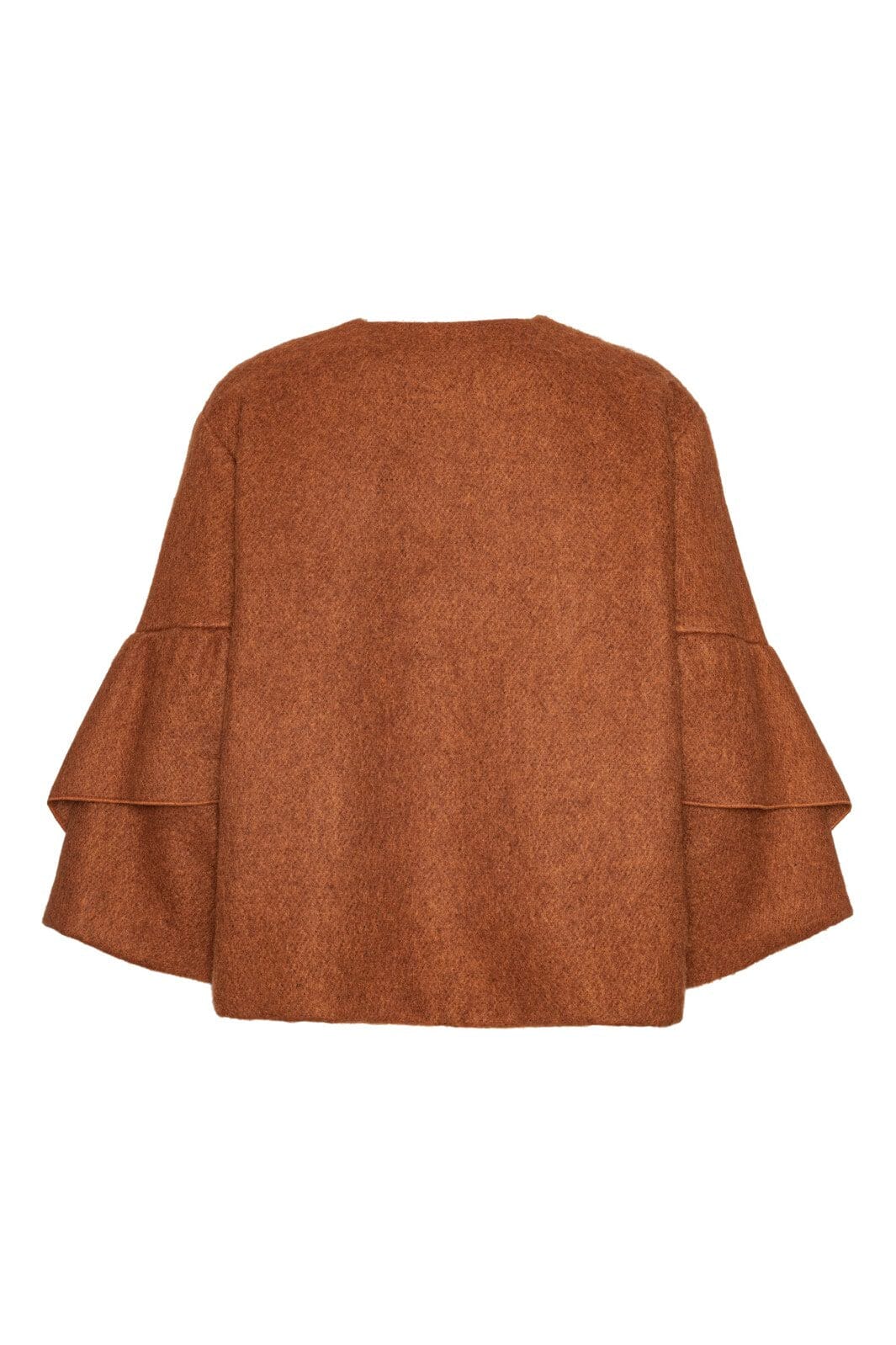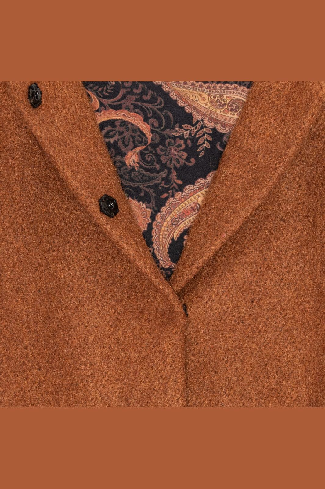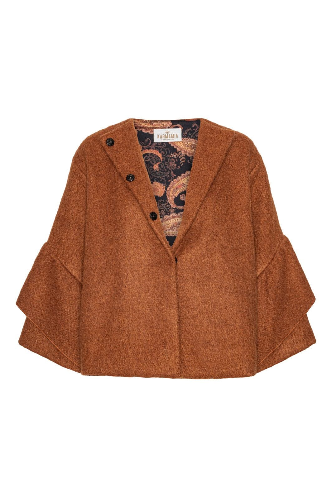 Brun jacka från Karmamia i begränsad upplaga. Den har en lös passform med 3/4 ärmar och skjortkrage. Insidan har ett paisleymönster, medan utsidan är enfärgad.