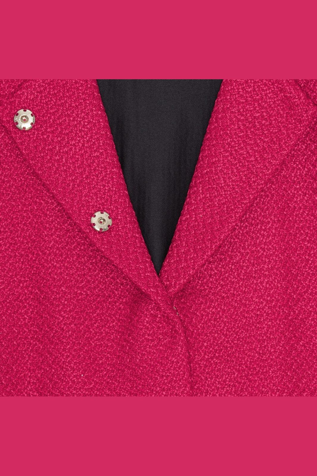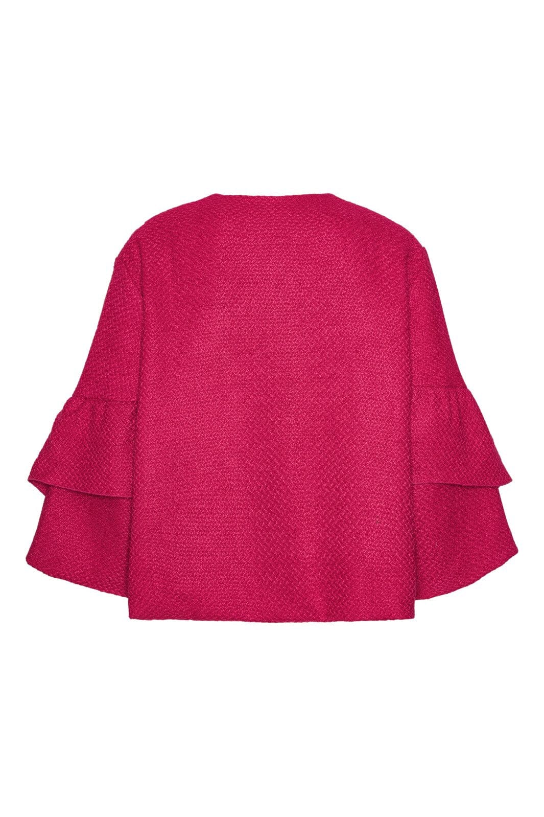 Rosa jacka från Karmamia i ett vävt tyg med svart foder. Jackan har breda ärmar med volanger och två metallknappar fram. Den är en del av en begränsad kollektion.