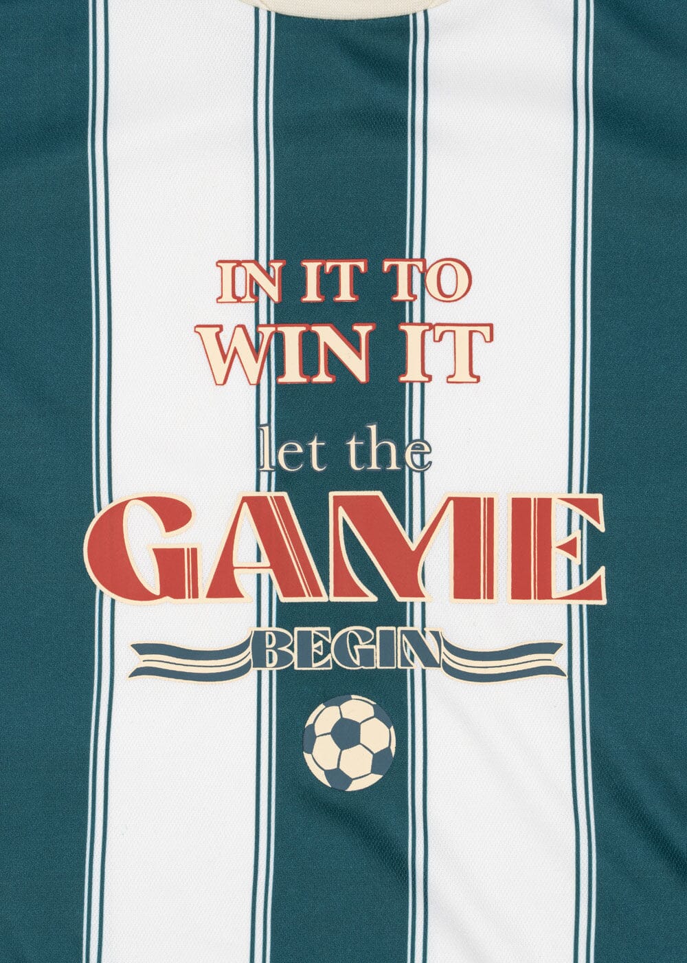 En randig t-shirt från Konges Sløjd med breda, vertikala ränder i gröna och vita nyanser. T-shirten har texten IN IT TO WIN IT, let the GAME BEGIN på framsidan.