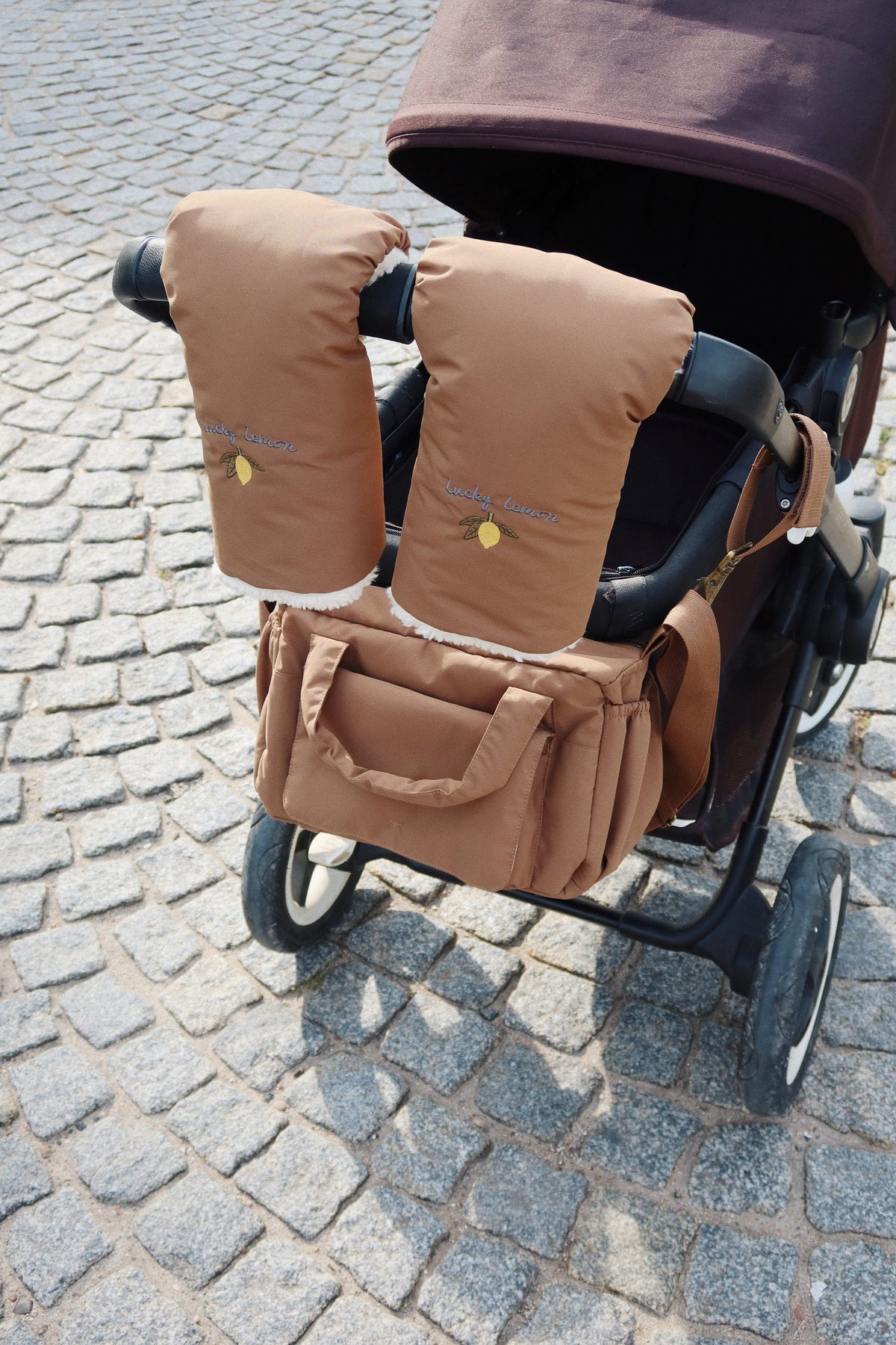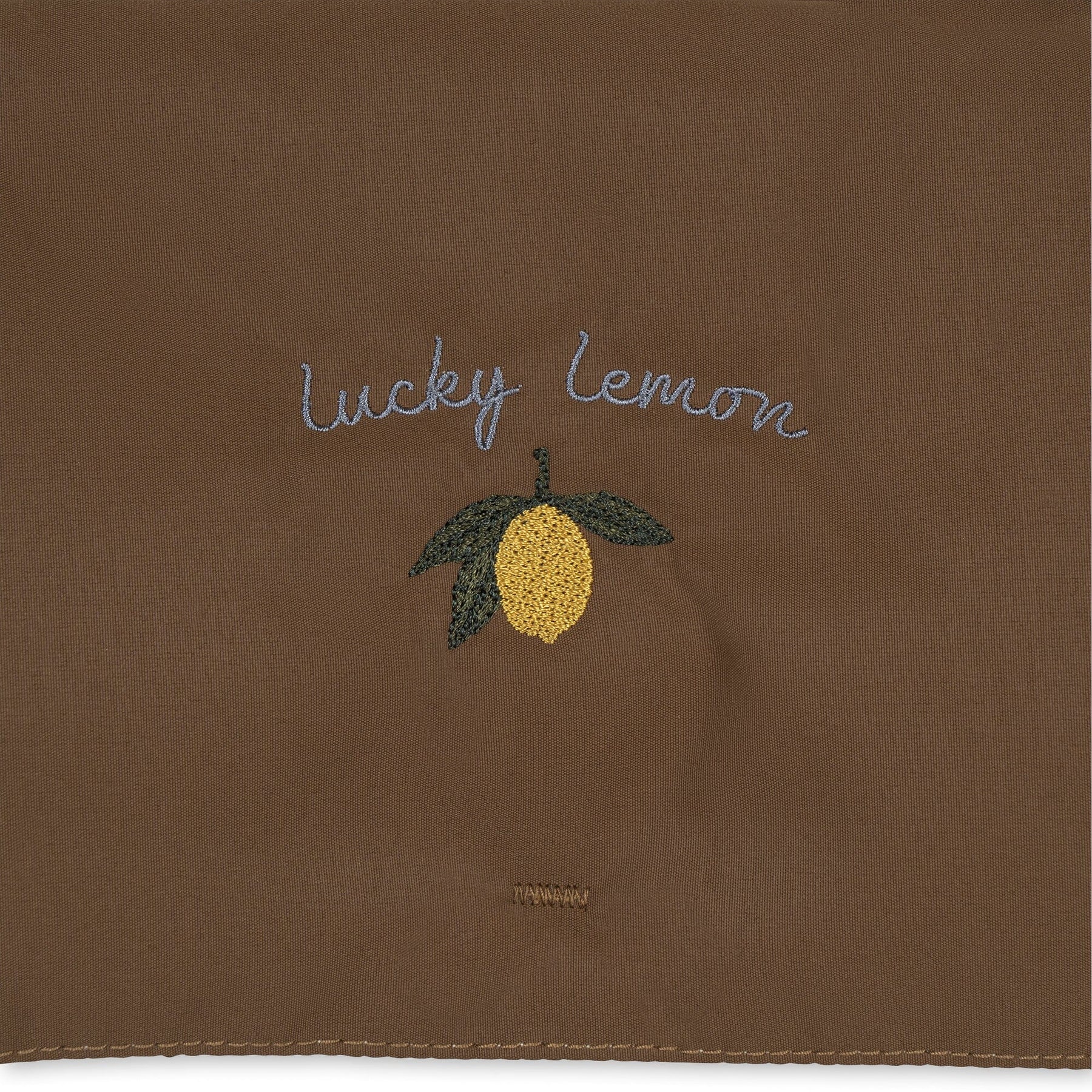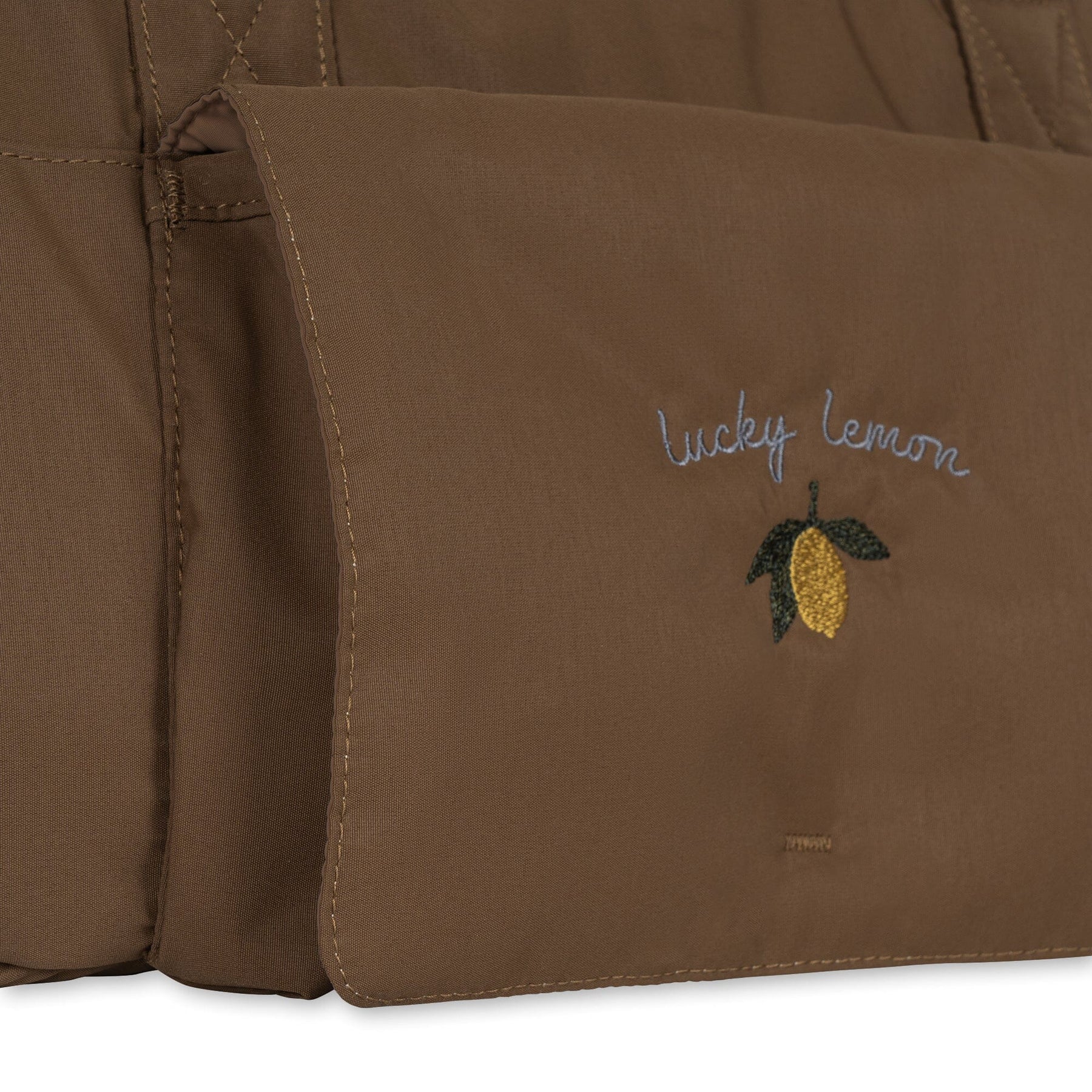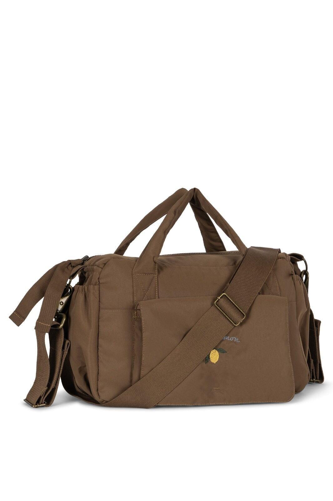 Brun minitaske från Konges Sløjd med axelrem och dragkedjestängning. Väskan har specialdesignade fickor för våtservetter och en termoficka för flaskor. Den broderade citrondetaljen ger väskan en personlig touch.