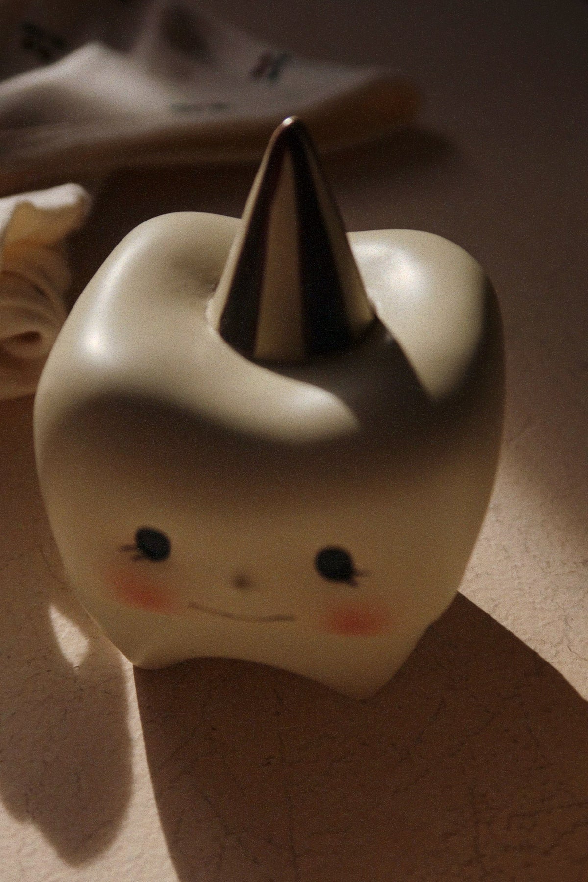 En tandformad förvaringslåda från Konges Sløjd med dekorativa detaljer. Lådan är formad som en tand och har ett ansikte på framsidan.