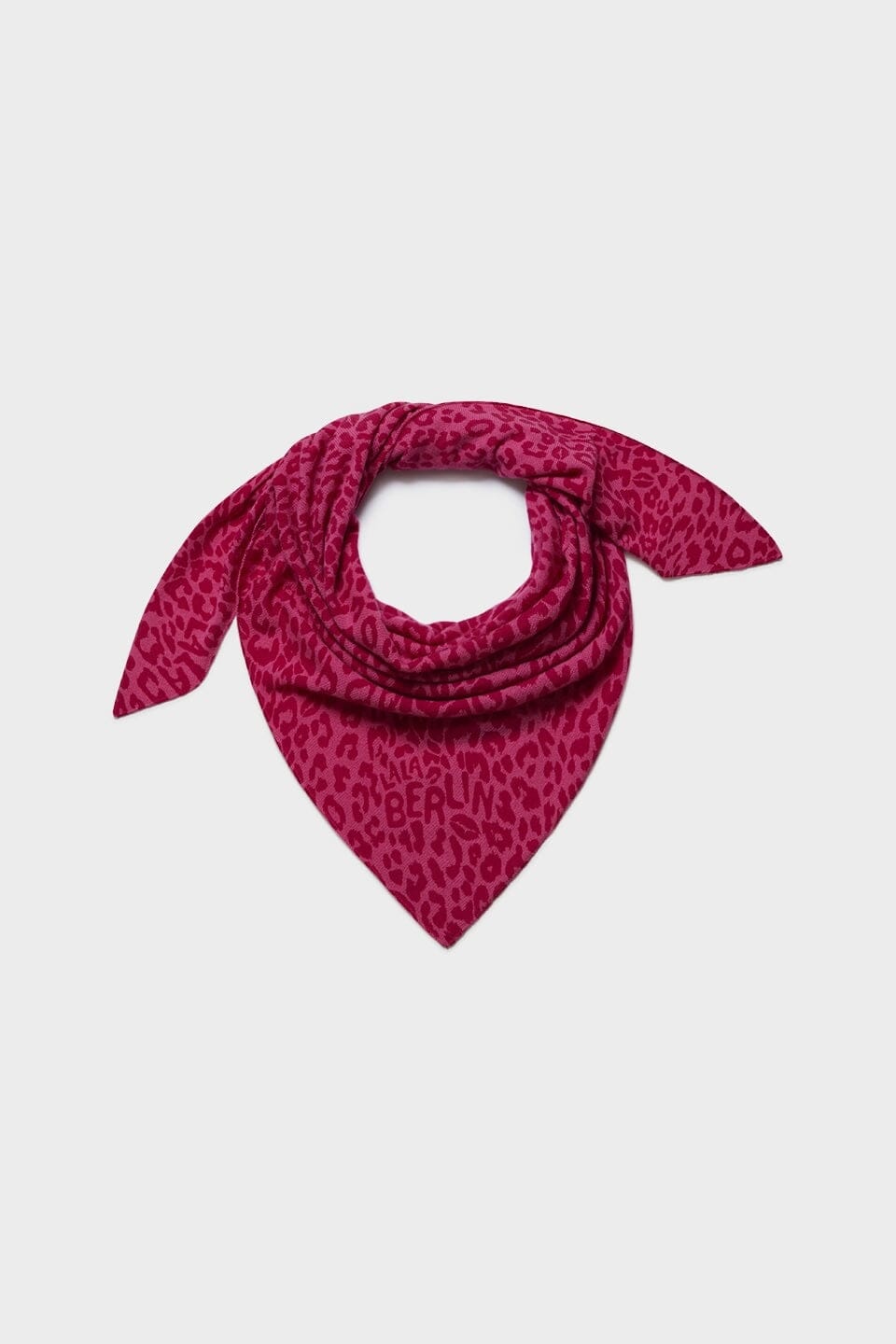 En trekantig scarf från Lala Berlin, tillverkad av tryckt kashmir med ett rosa leopardmönster. Designen kombinerar mjuk komfort med ett djärvt uttryck.