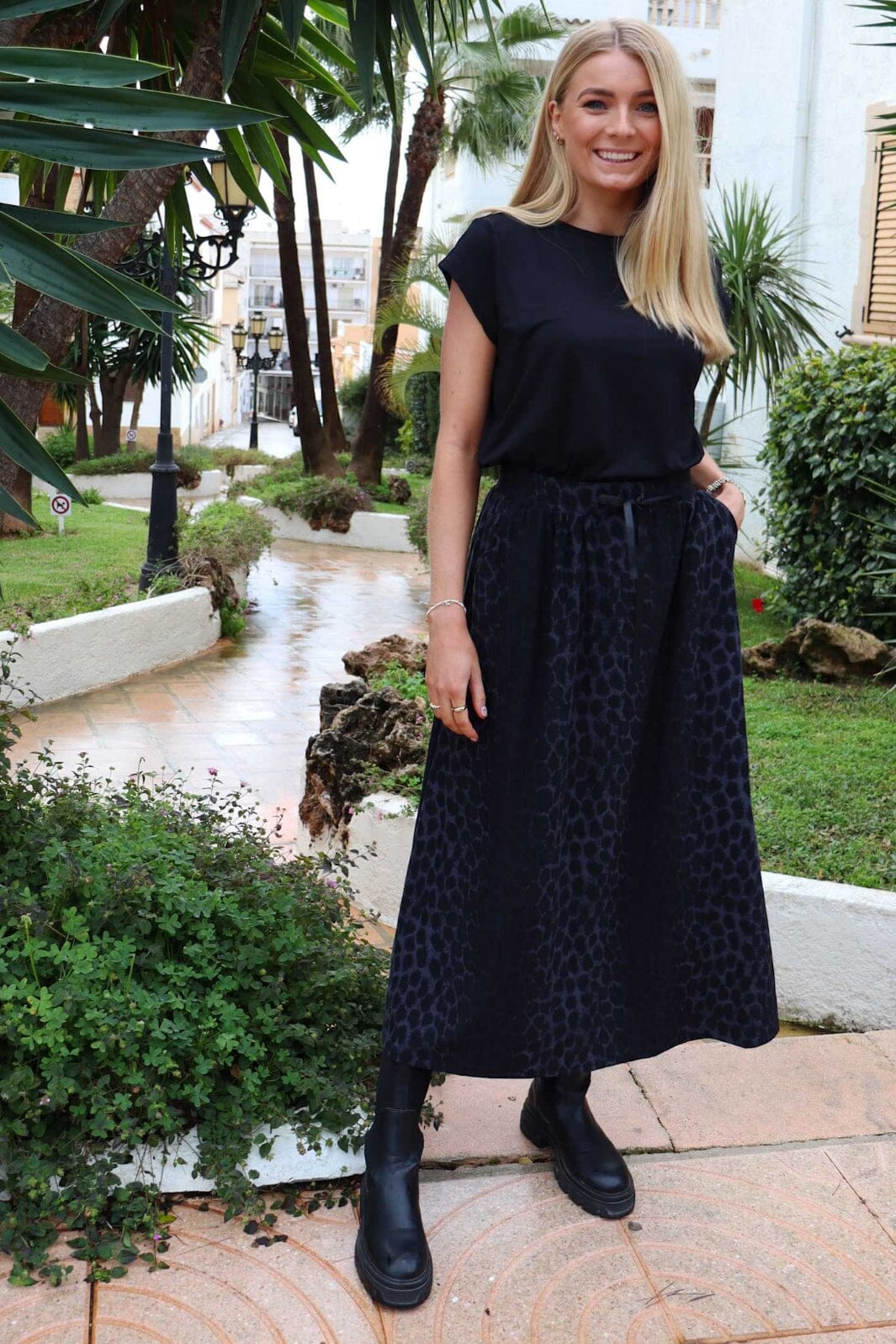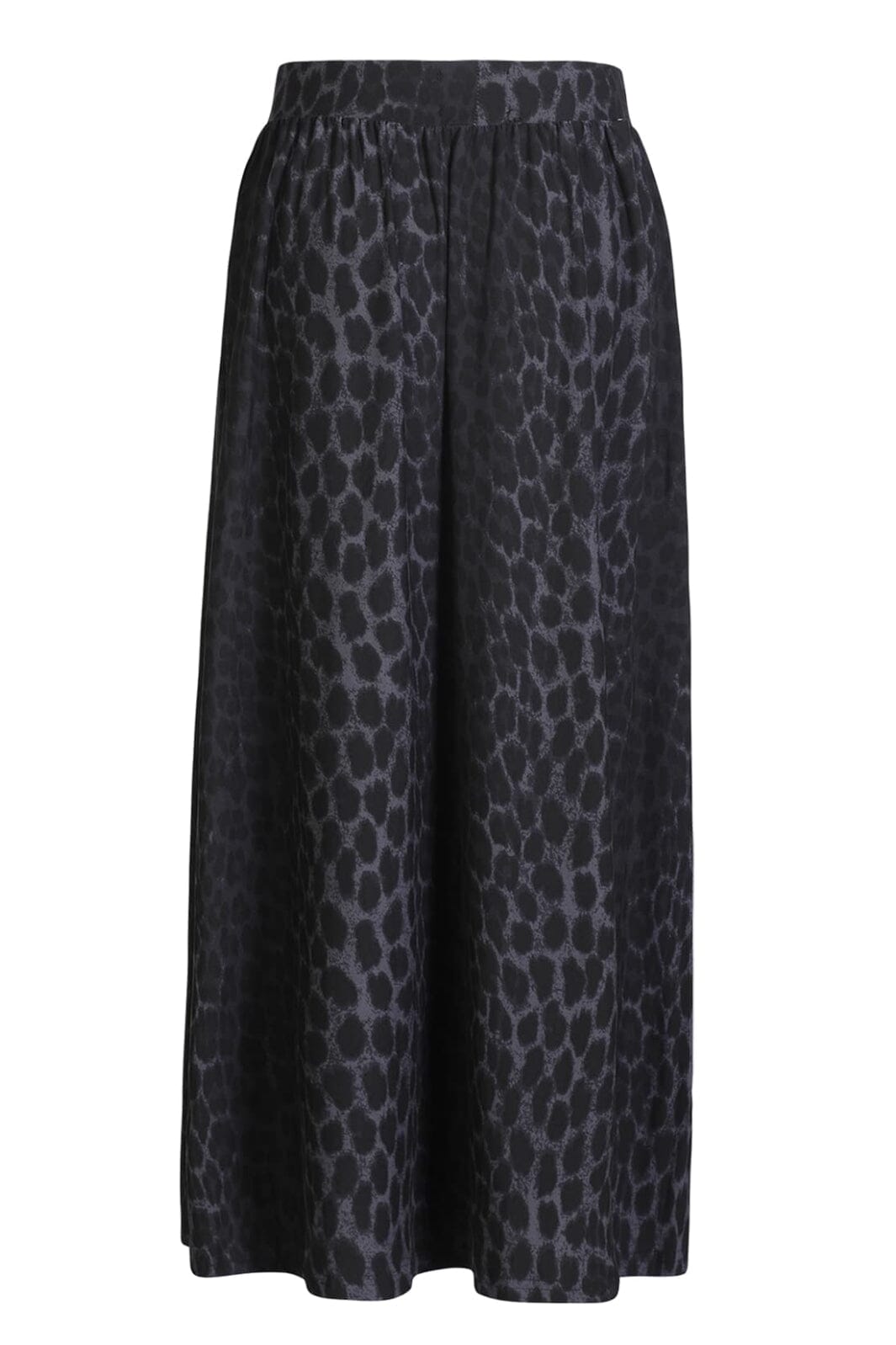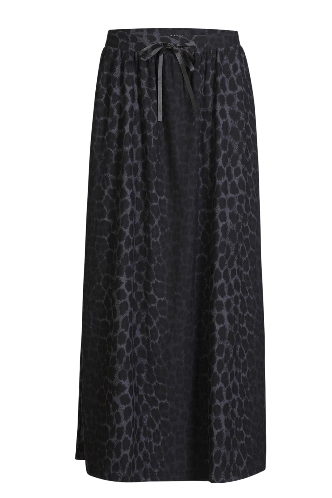 Mörkgrå kjol från Liberte med diskret leopardmönster. Den lösa modellen har en bekväm passform och når till vristerna. Snöret i midjan ger möjlighet att justera vidden.