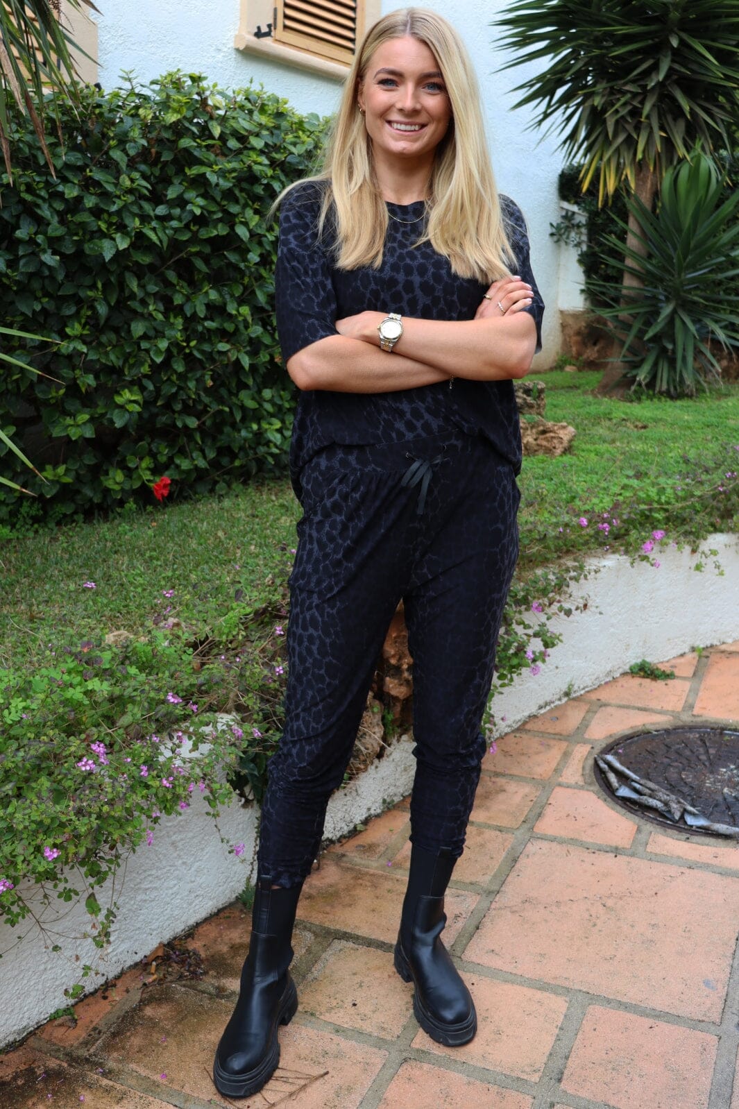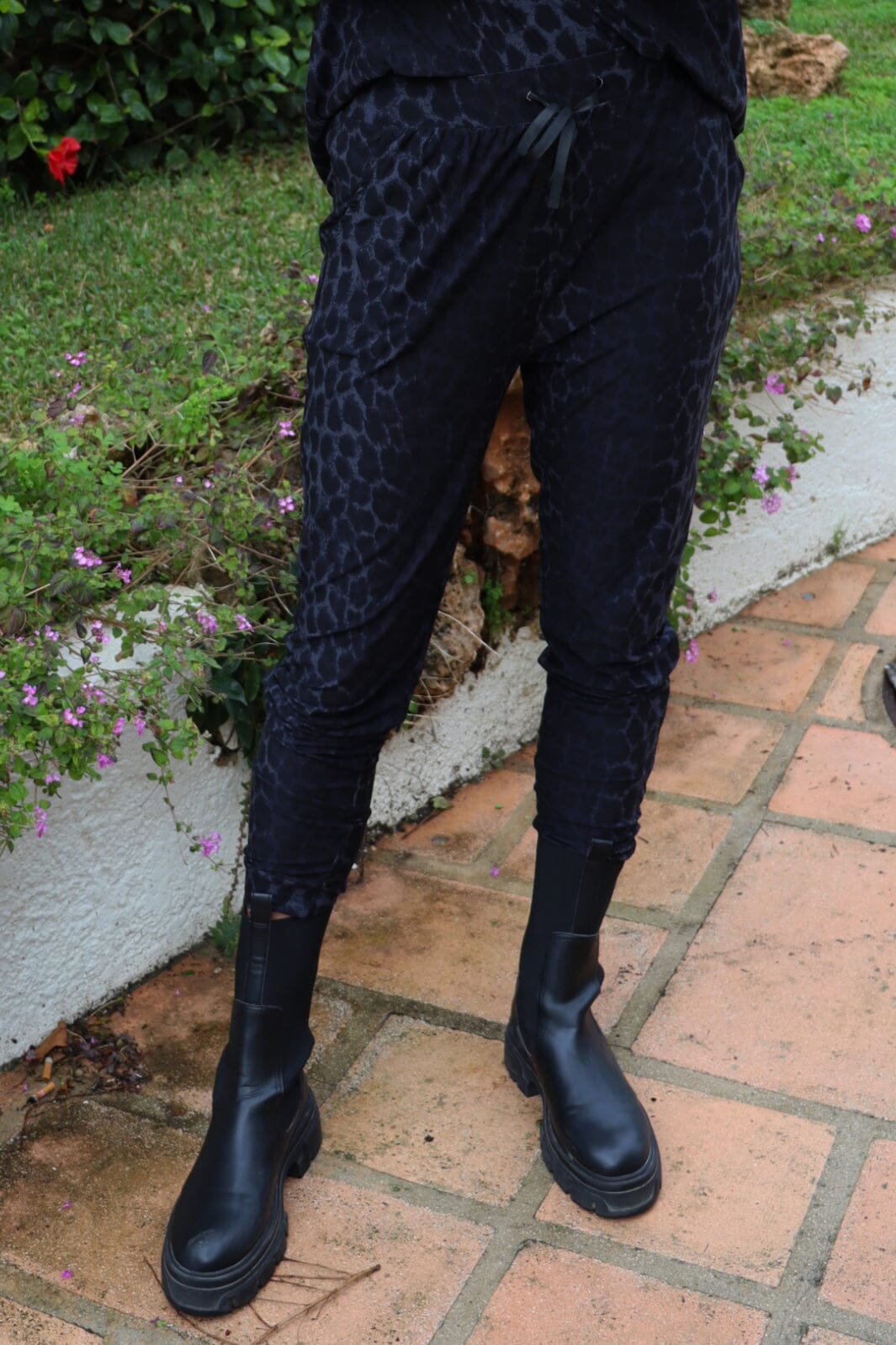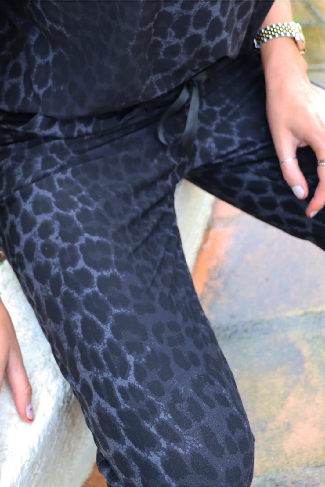 Byxor från Liberte i Alma-kvalitet med mörkgrått leopardmönster. Byxorna har en lös passform och ankellängd med elastisk midja och snördetalj.