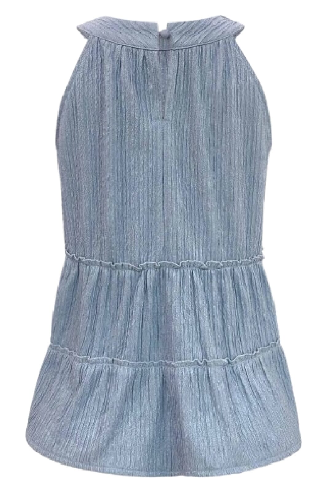 Ärmlös topp från Liberte i en ljusblå nyans. Toppen har en hög hals och en lagerkant med volanger som skapar rörelse i designen. Den passar både till vardag och fest.