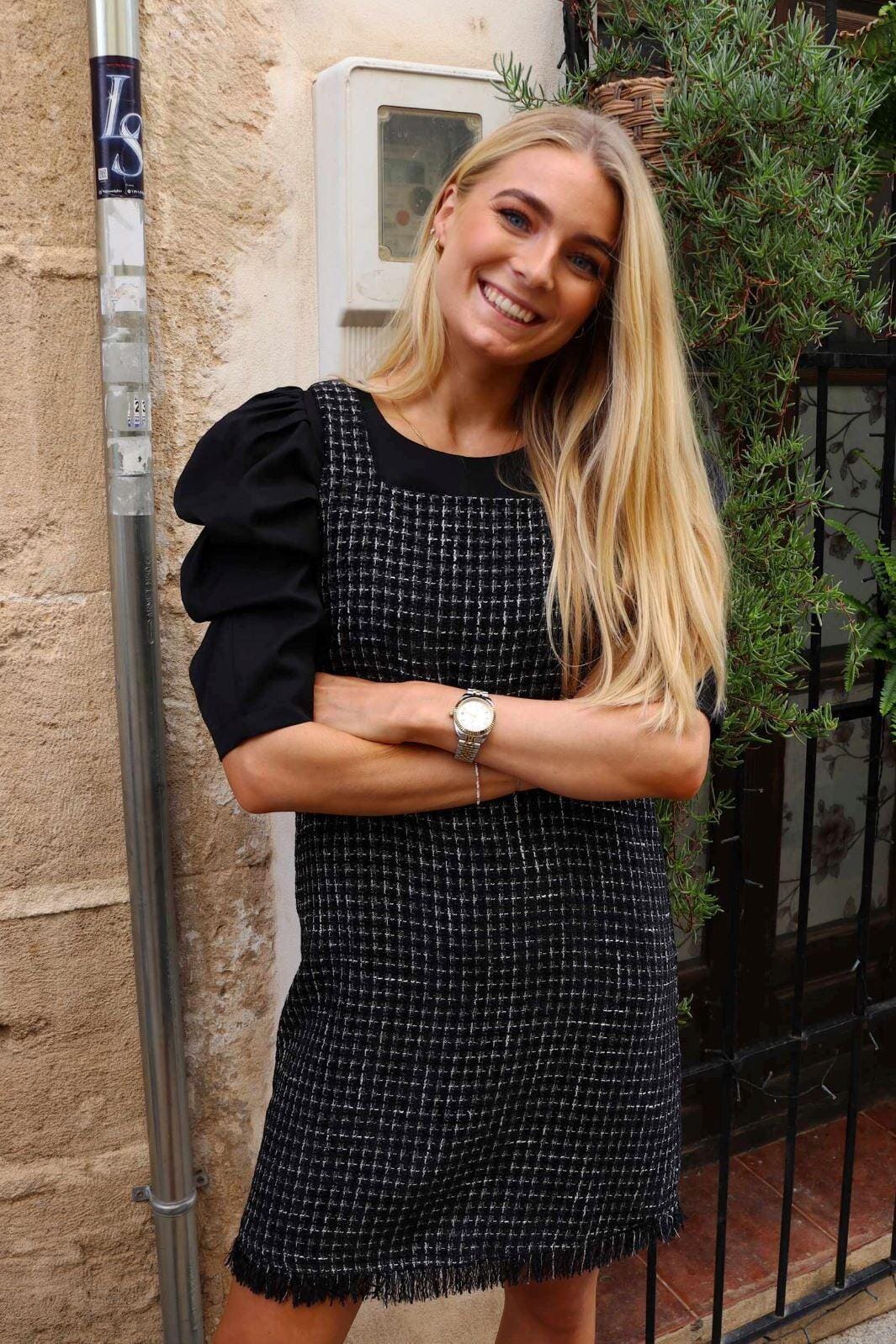 Rutigt klänning från Liberte i grått och svart. Klänningen har puffärmar och en rund hals. Fransen längs klänningen skapar en rå look, medan det rutiga mönstret ger ett grafiskt uttryck.
