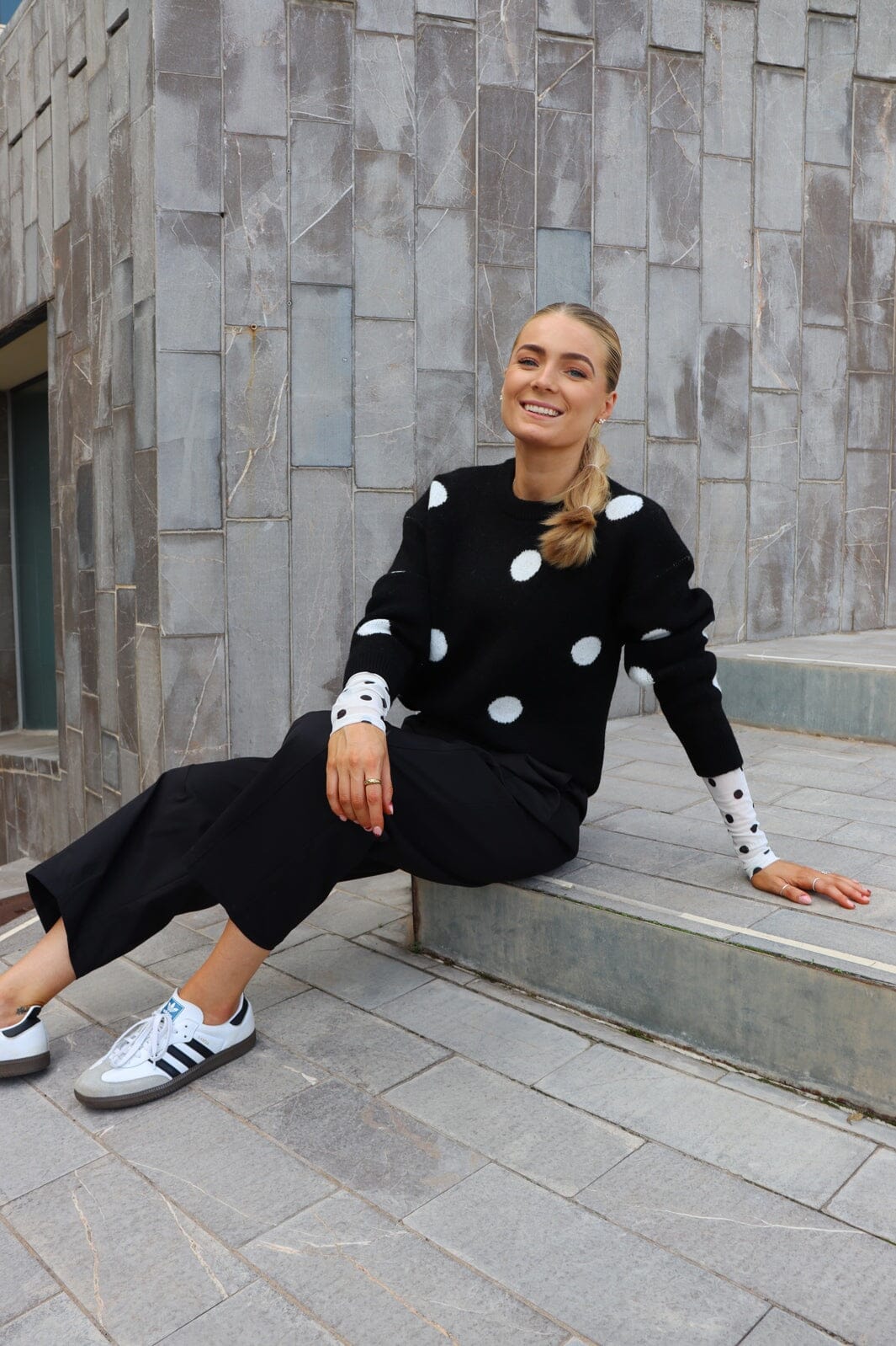 Svart tröja från Liberte med vita prickar. Tröjan har en rund halsringning, långa ärmar och en lös passform.
