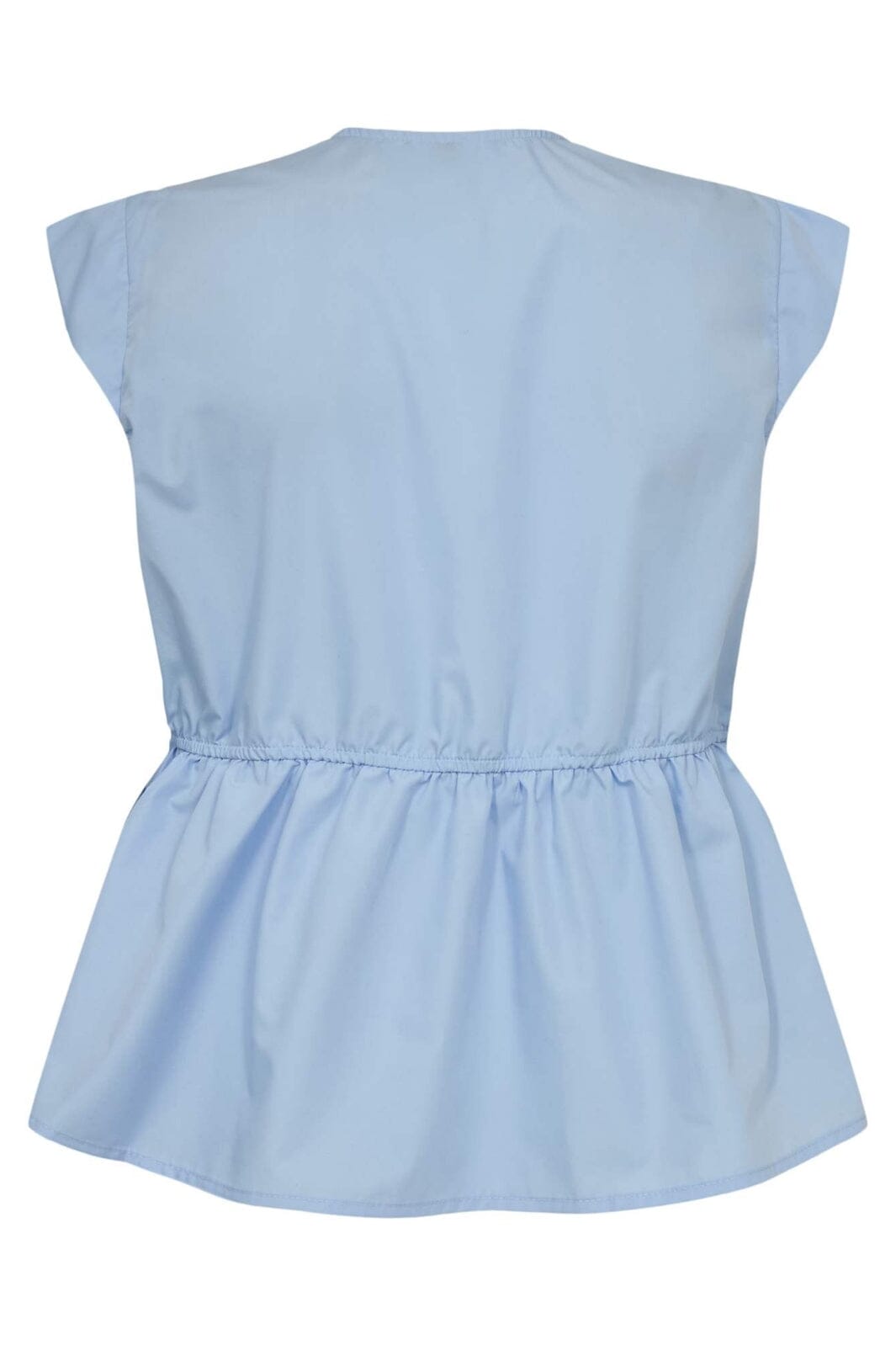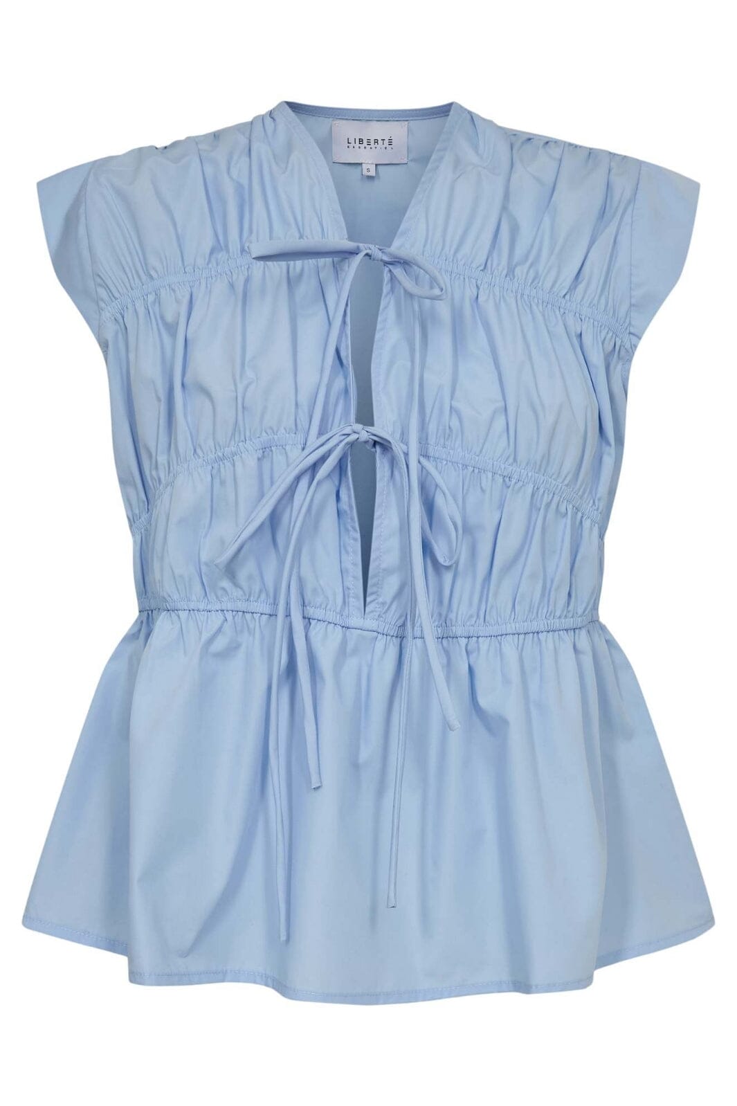 Ljusblå topp från Liberte med knytband och volanger. Toppen har en V-ringning och korta ärmar med en samlad design som ger en vacker silhuett.