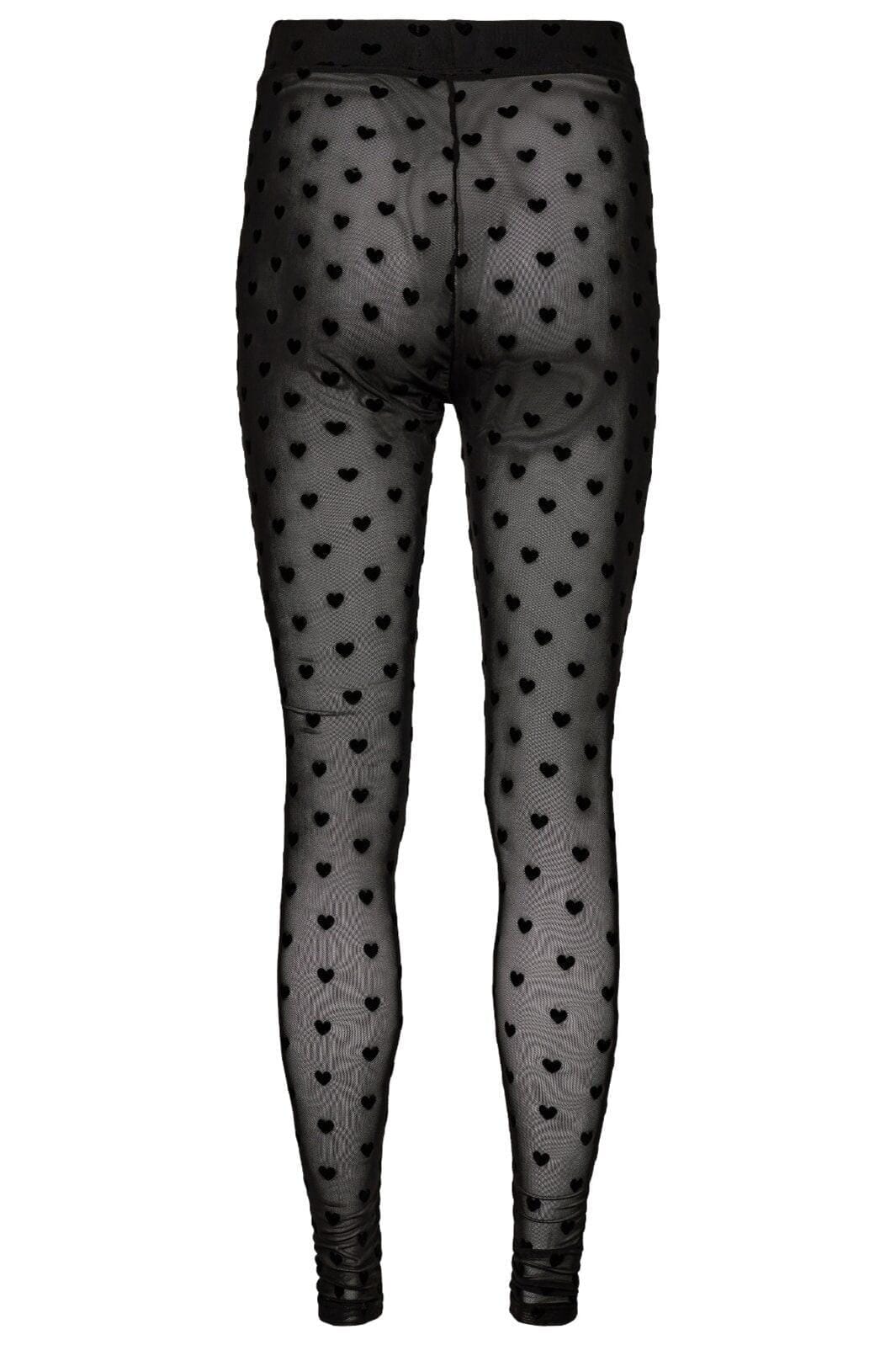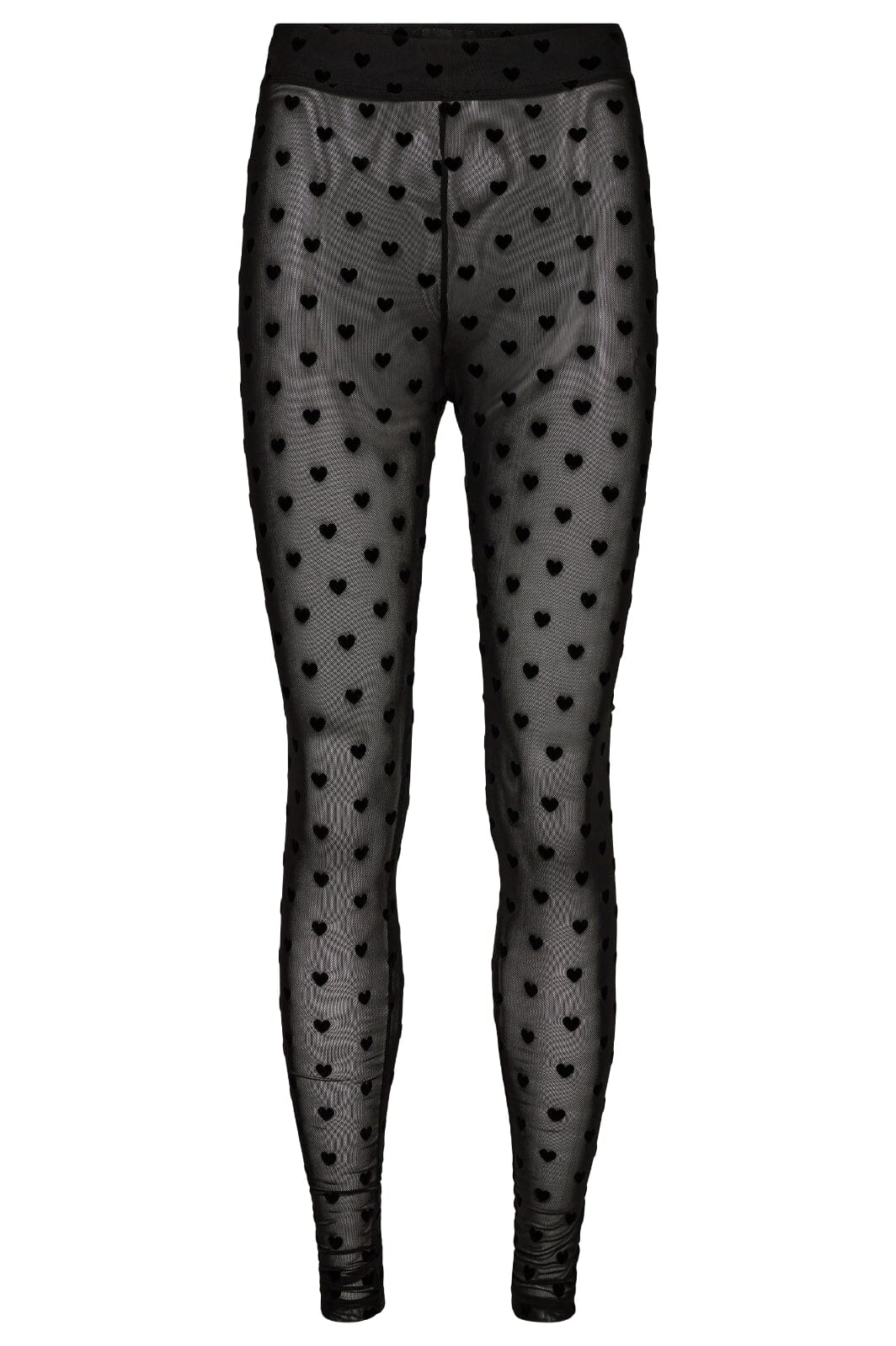 Svarta leggings från Liberte i mesh-material med flockhjärtan. Ett genomgående hjärtmönster i flocktryck pryder hela byxans yta.
