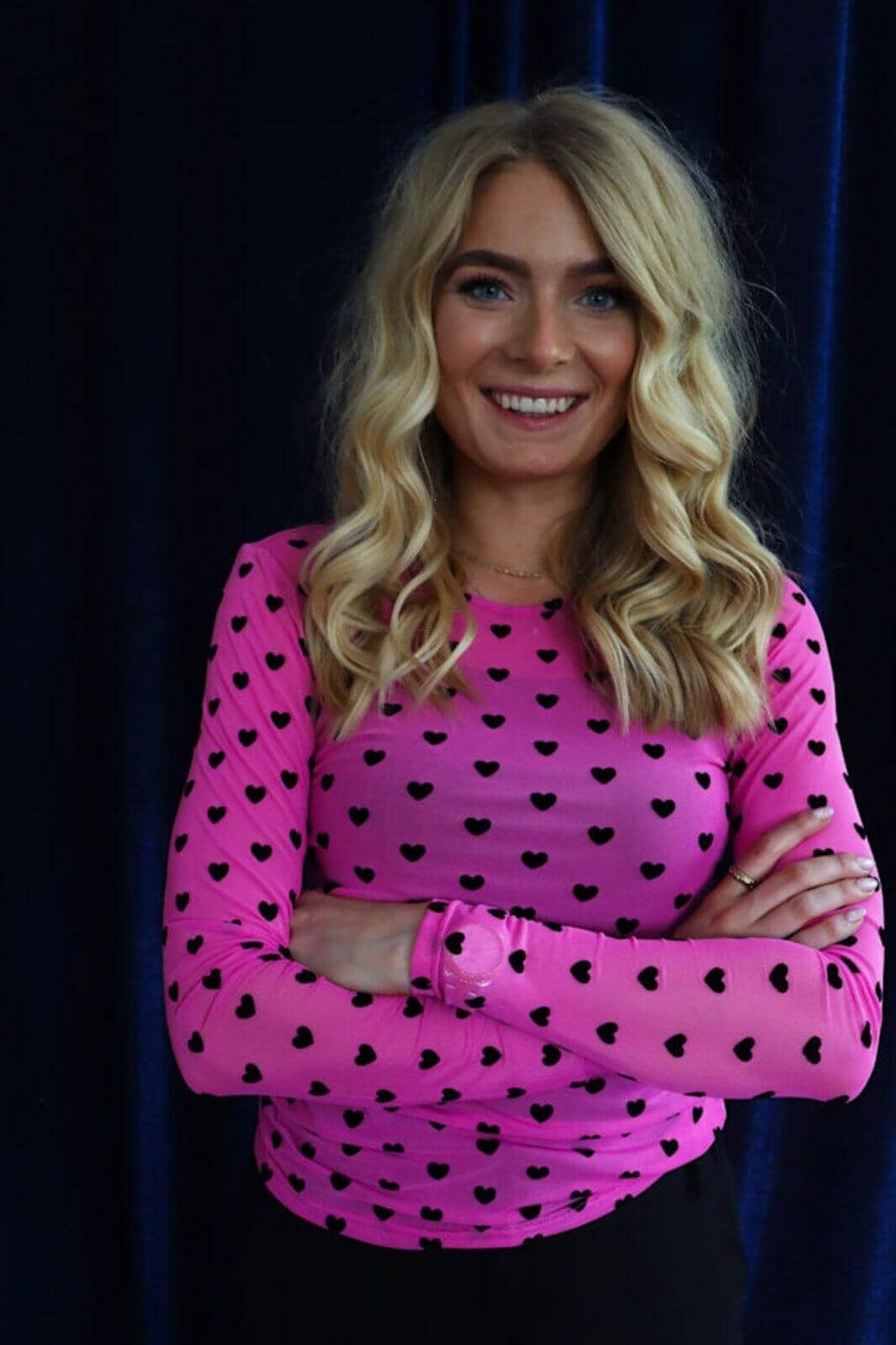 Rosa långärmad mesh-t-shirt från Liberte med svarta hjärtan över hela ytan. T-shirten har en slim fit-passform och rund halsringning.