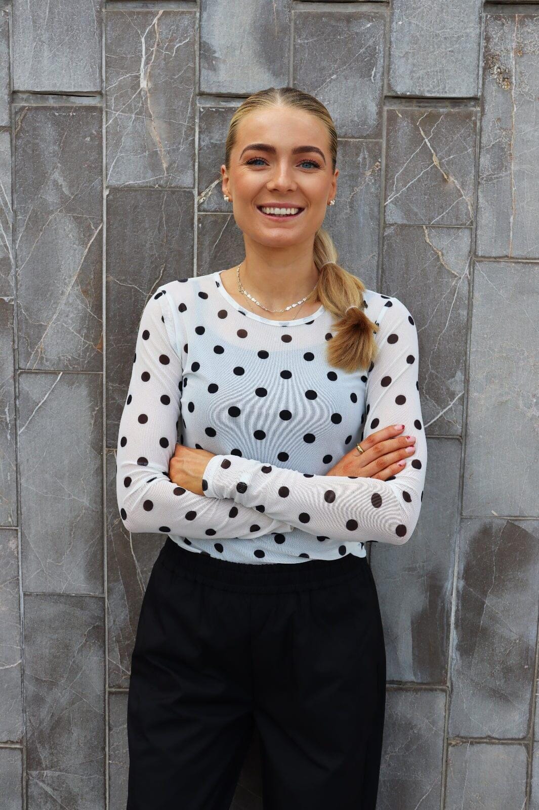 En mesh-t-shirt från Liberte med långa ärmar. Den vita basen har stora svarta prickar i ett polka dot-mönster.