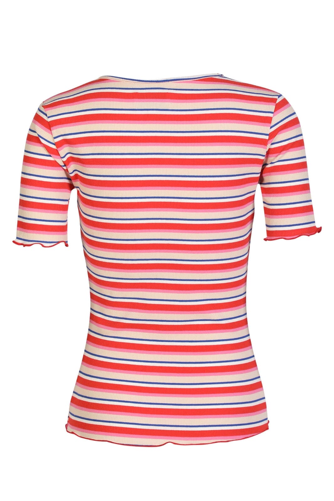 Randig blus från Liberte med korta ärmar och rund hals. Blusen har ett somrigt randigt mönster i kräm, orange och blå nyanser med vågiga kanter på ärmarna.