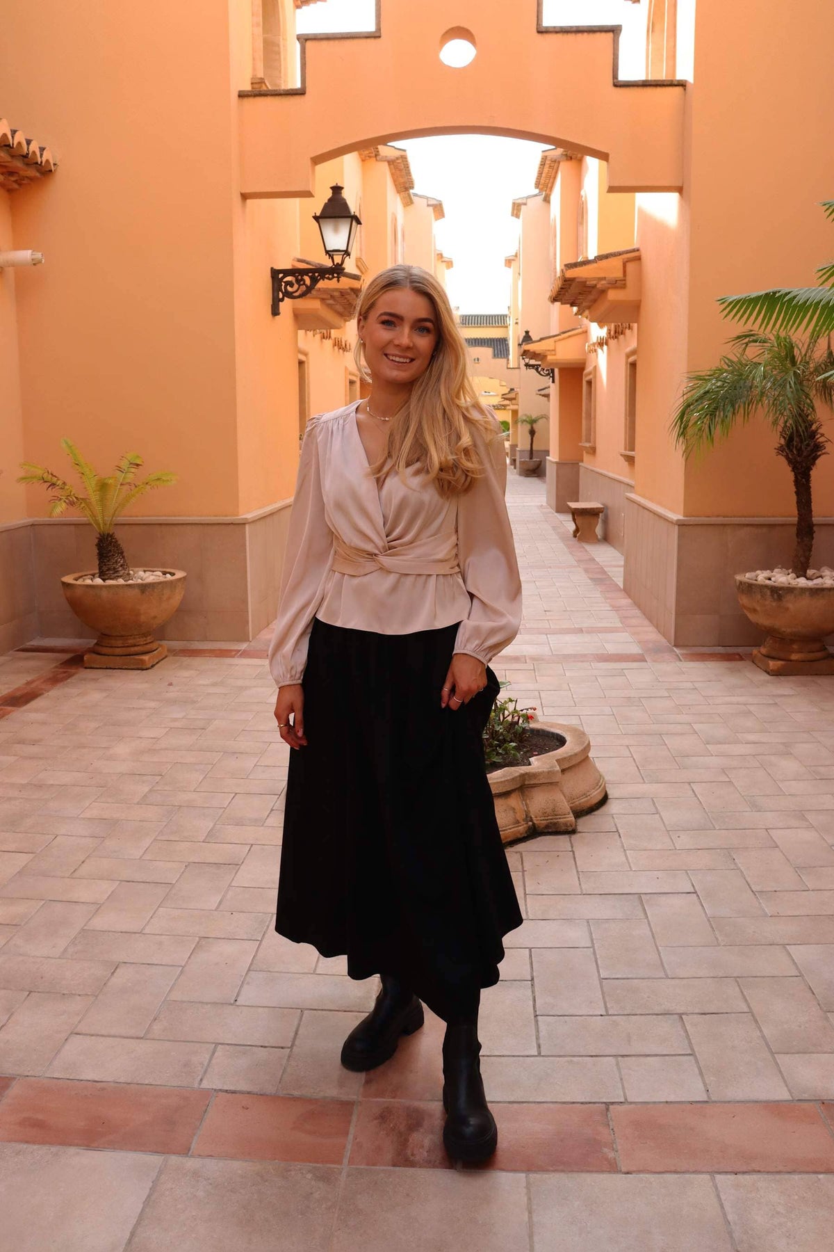 En blus från Liberte i en ljus beige champagnenyans, tillverkad av 100 % polyester. Blusen har en twistdetalj framtill och en rynkad sektion baktill.