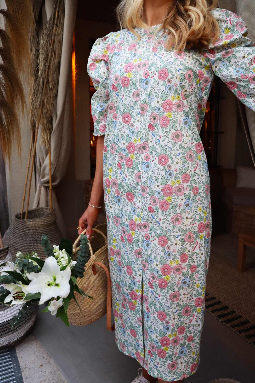 Klänning från Liberte i elfenbensfärg med blommönster i pastellfärger. Klänningen har puffärmar i 3/4-längd och volangdetaljer på ärmarna och vid halsen.