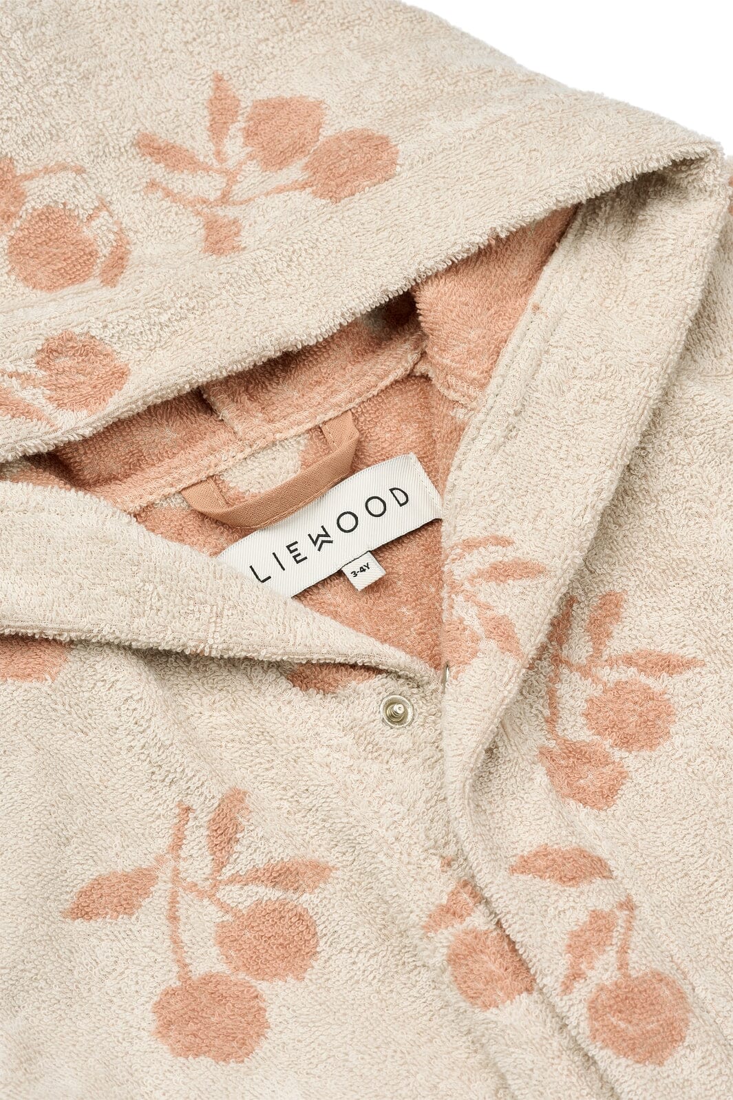 Badrrobe från Liewood i färgerna persika och musselvit. Den är gjord av ekologisk bomull med ett blommönster och har en huva samt bälte i midjan.