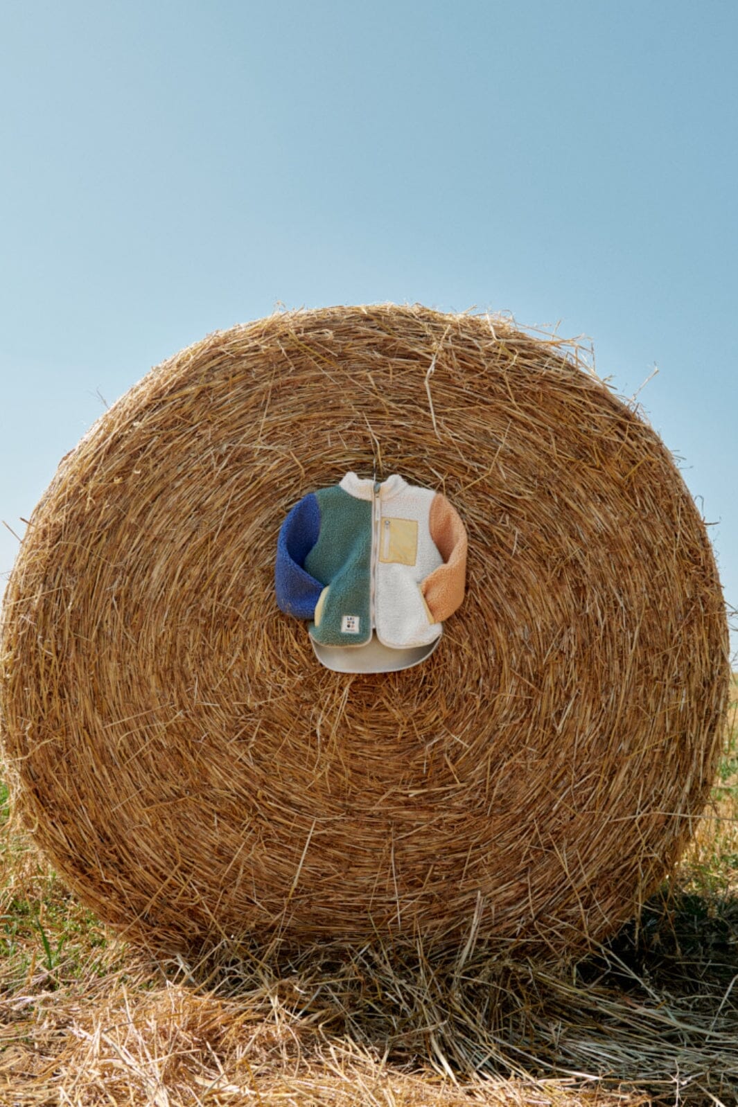 Pilejacka från Liewood i blå, grön, vit och orange färgblock. Den mjuka jackan har en hög krage och dragkedjestängning fram samt praktiska fickor.