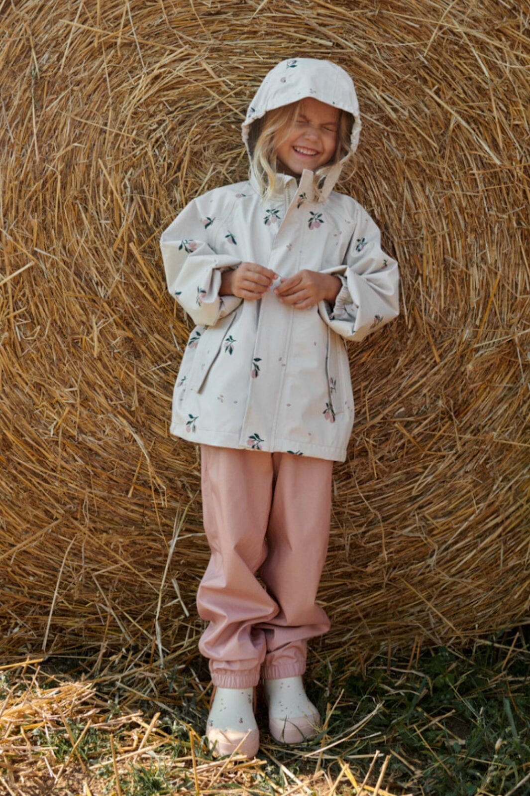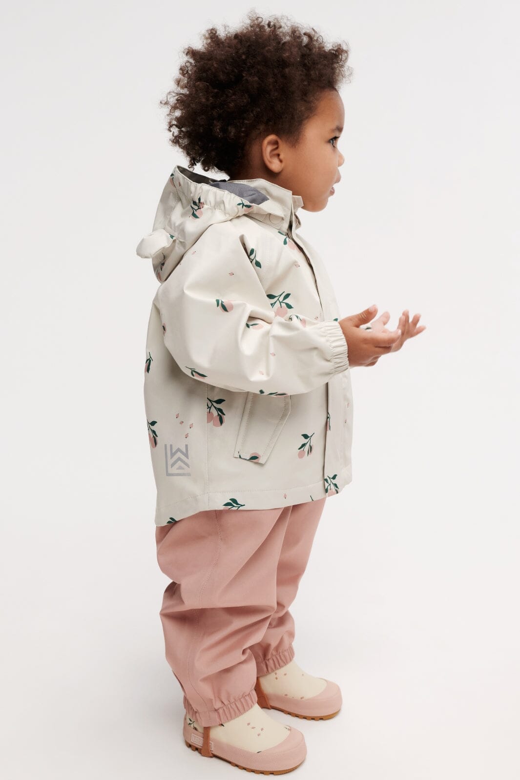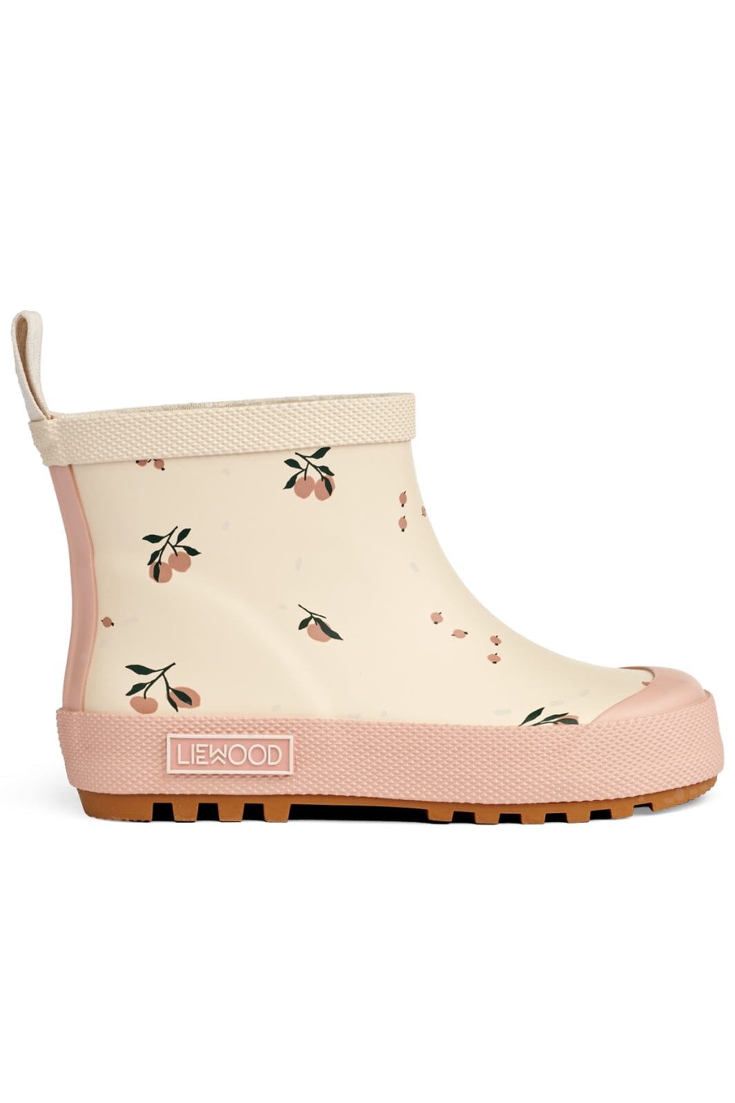 Ankelhöga gummistövlar från Liewood i persika och musselvit. Stövlarna har ett blommönster med små persikoillustrationer på en ljus bakgrund.