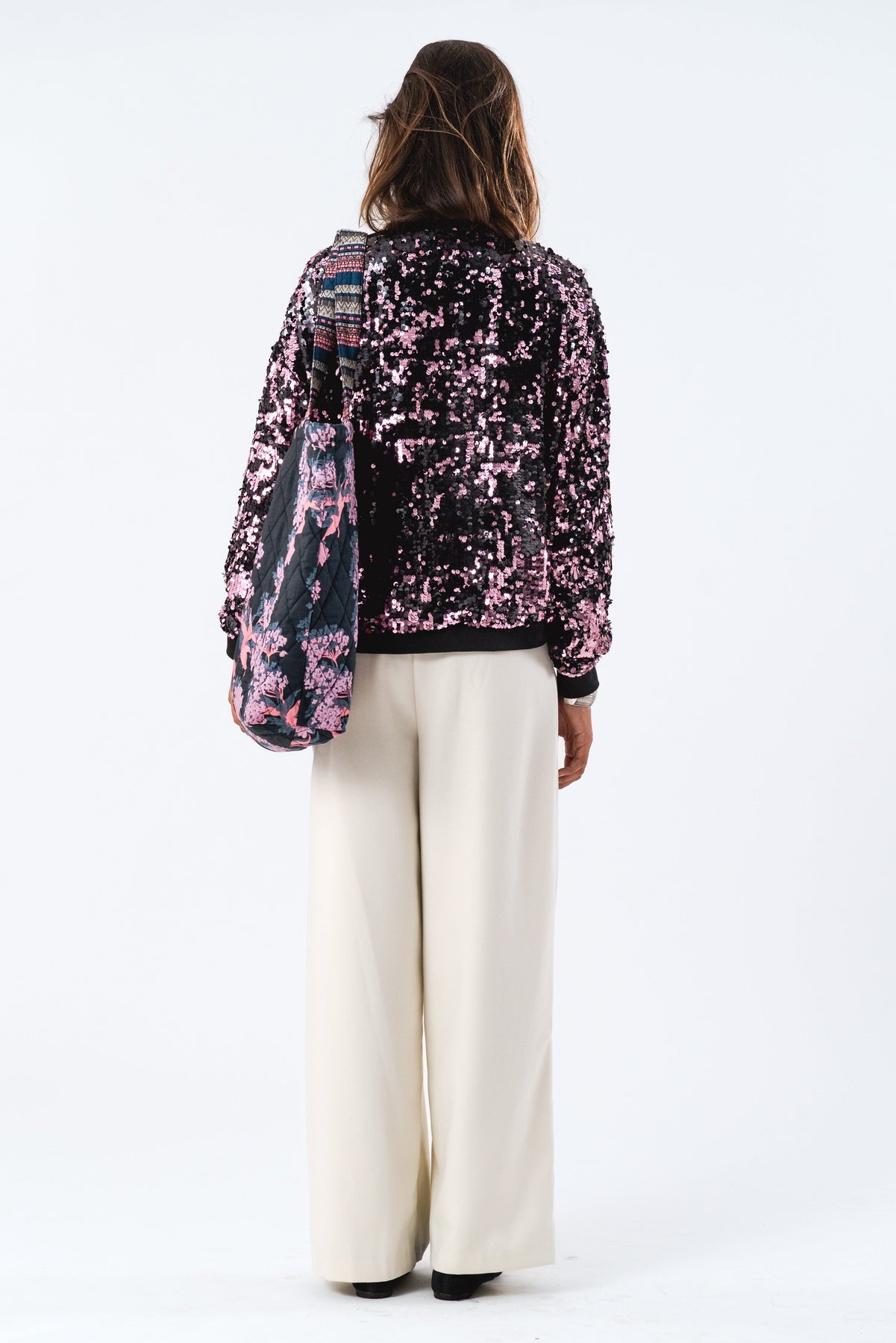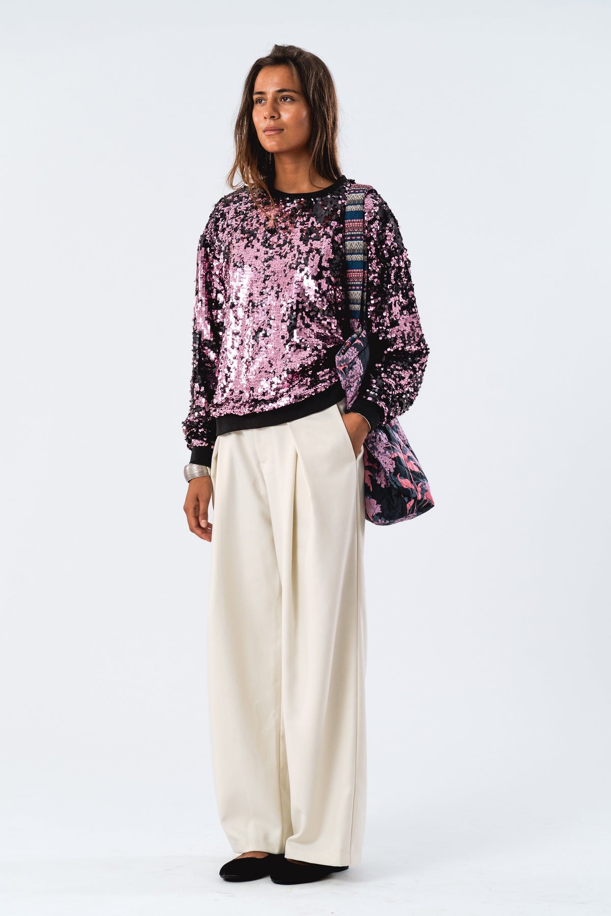 Ljus rosa sweatshirt från Lollys Laundry med paljetter över hela ytan. Den har svarta kanter vid ärmarna och botten, vilket skapar kontrast till de glänsande paljetterna.