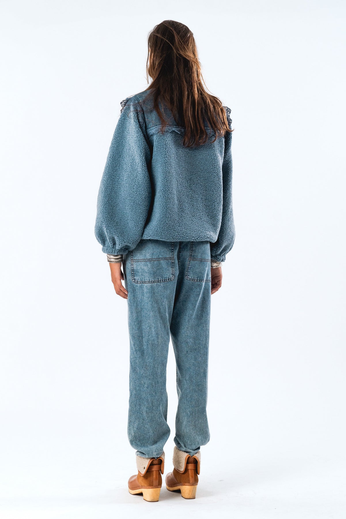 Dammig blå jacka från Lollys Laundry med fluffig textur och quiltad överdel. Den höga kragen och de långa ärmarna ger bra skydd mot kylan.