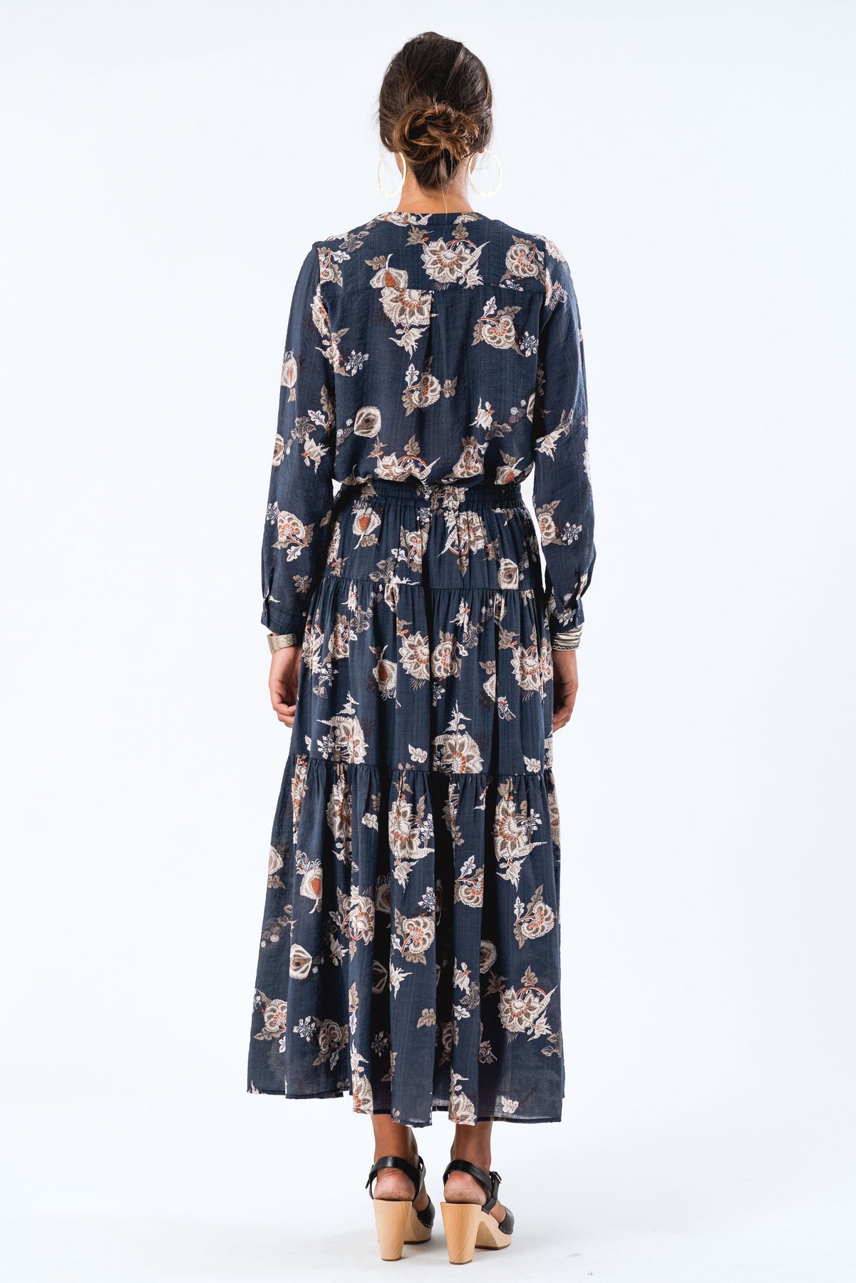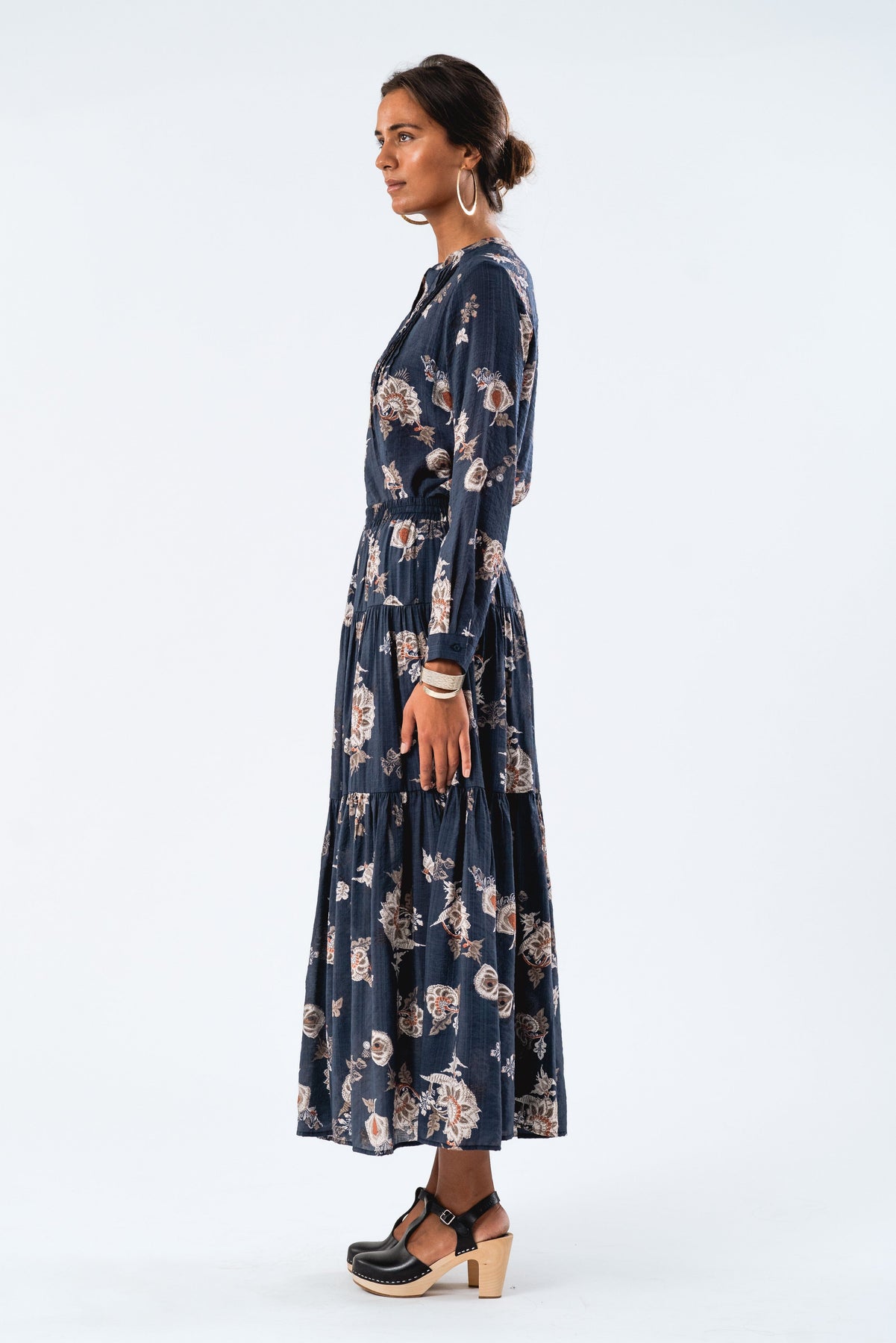 Mörkblå skjorta från Lollys Laundry med blommönster i beige och rostnyanser. Skjortan har V-hals och knapplåsning fram samt långa ärmar med knapp vid handleden.