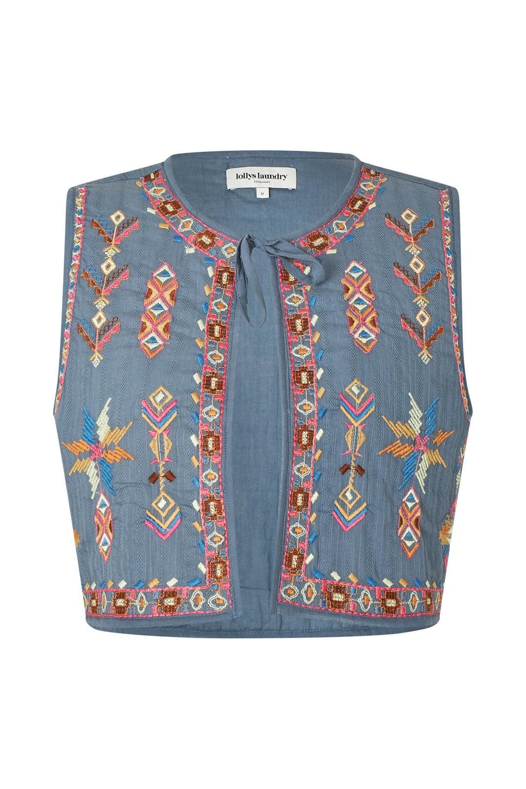 Dammblå väst från Lollys Laundry med färgglad broderi. Vesten har en rund hals med bindeband och är tillverkad i bomull med detaljerade mönster längs kanterna.