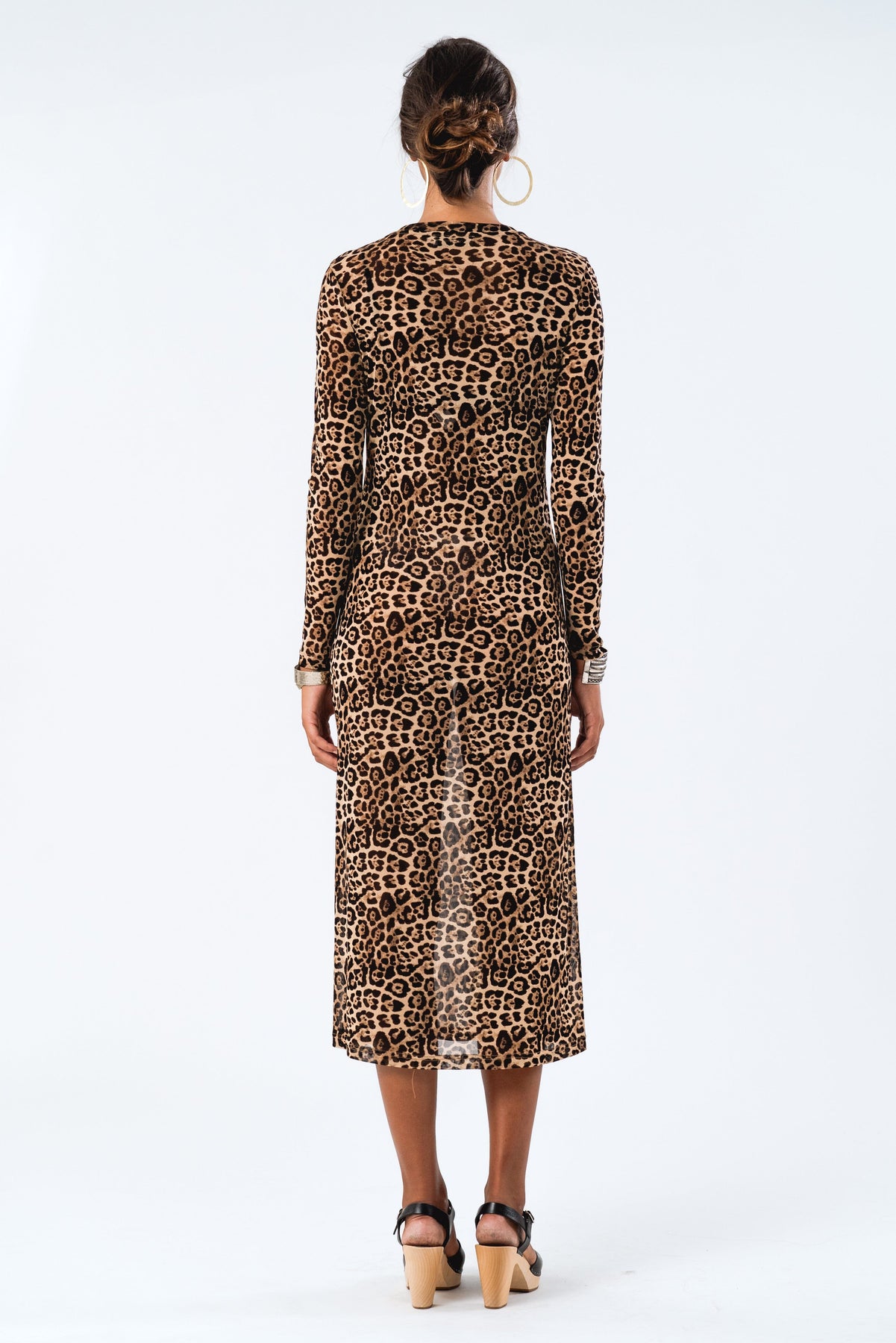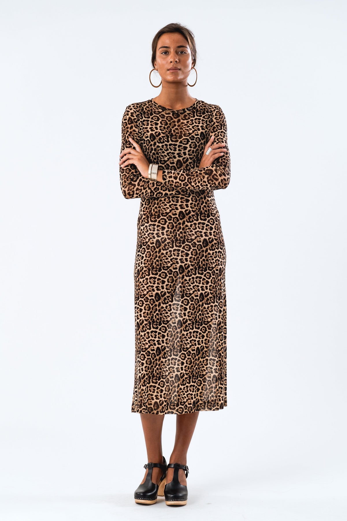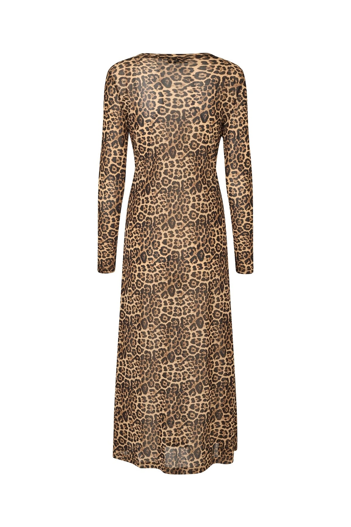 Långärmad maxiklänning från Lollys Laundry med leopardtryck i bruna och svarta nyanser på beige bakgrund. Klänningen har en rund halsringning och sträcker sig till anklarna.
