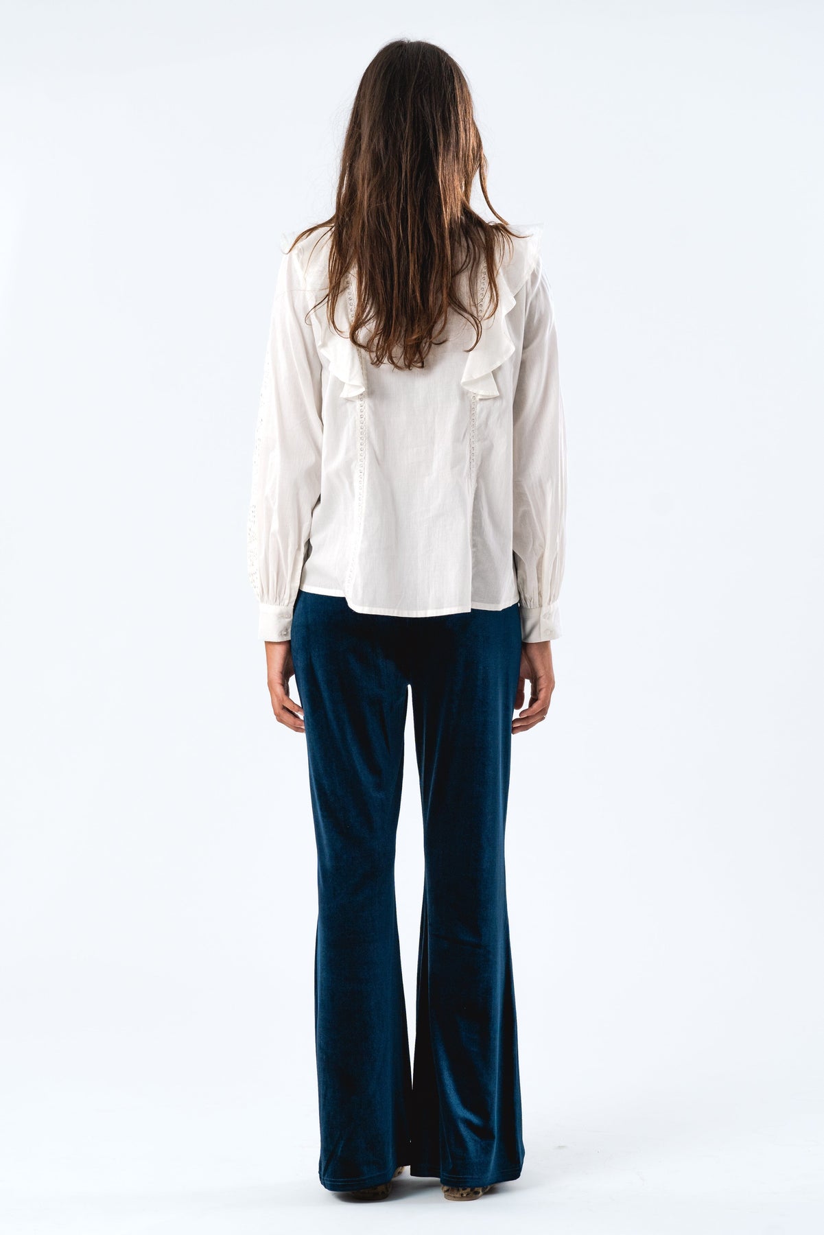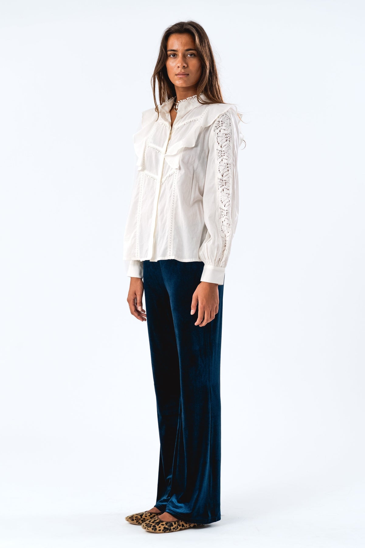 Cremevit skjorta från Lollys Laundry med hög krage och långa ärmar. Skjortan har broderi och volanger på framsidan samt spetsinsatser på ärmarna.