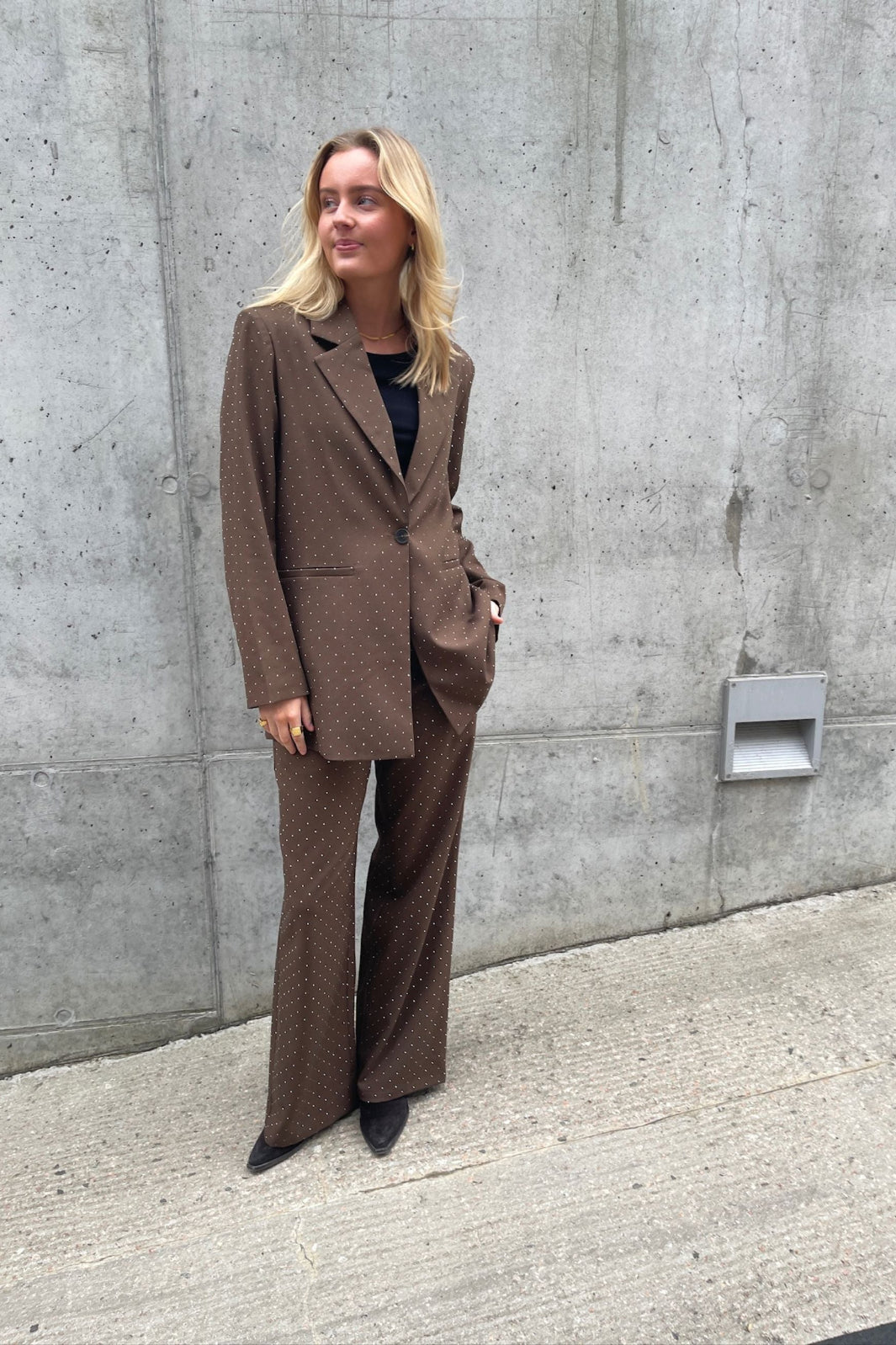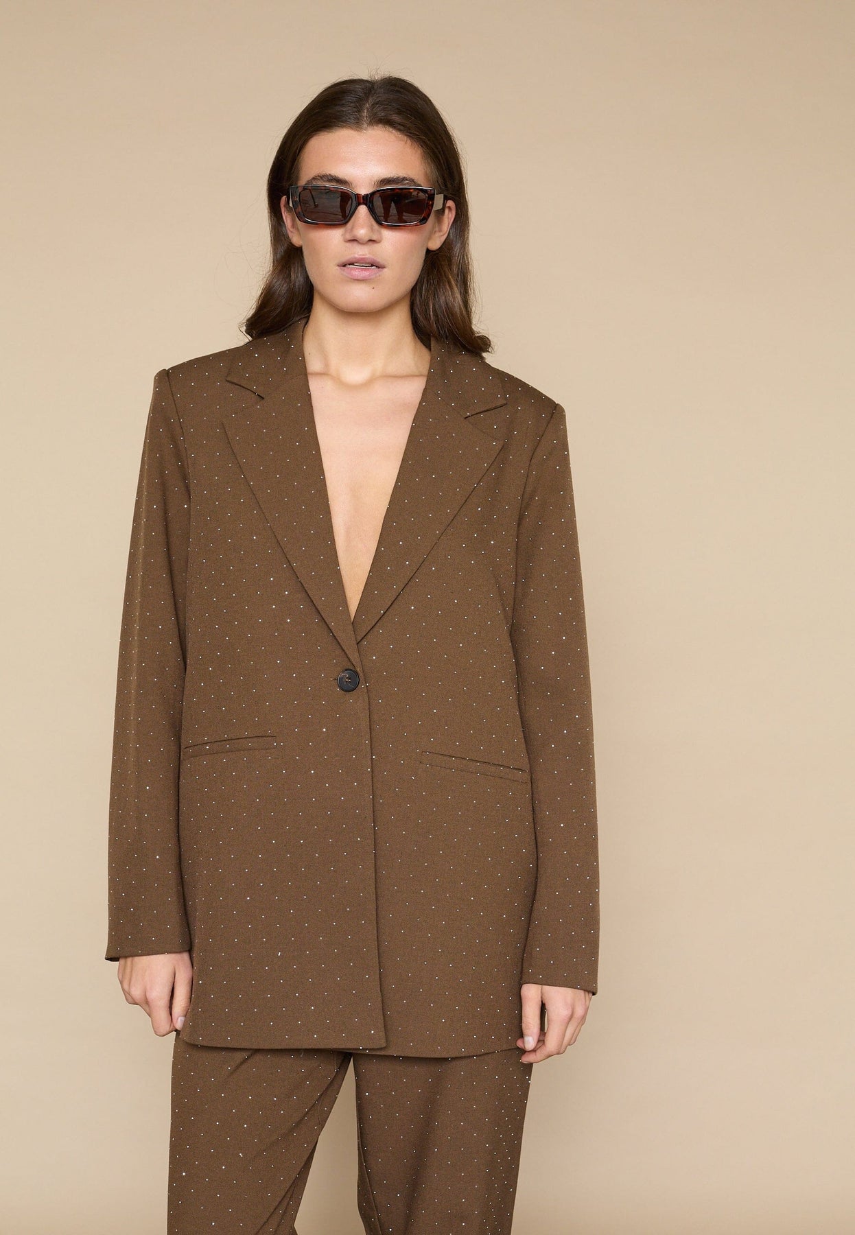 Kavaj från Love & Divine i brun färg med små rhinestone-detaljer. Jackan har en klassisk skärning med slag och enkel knäppning.