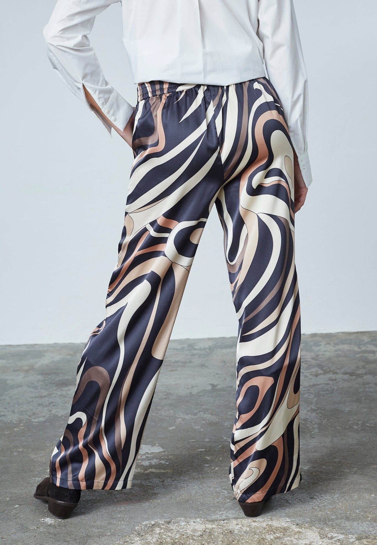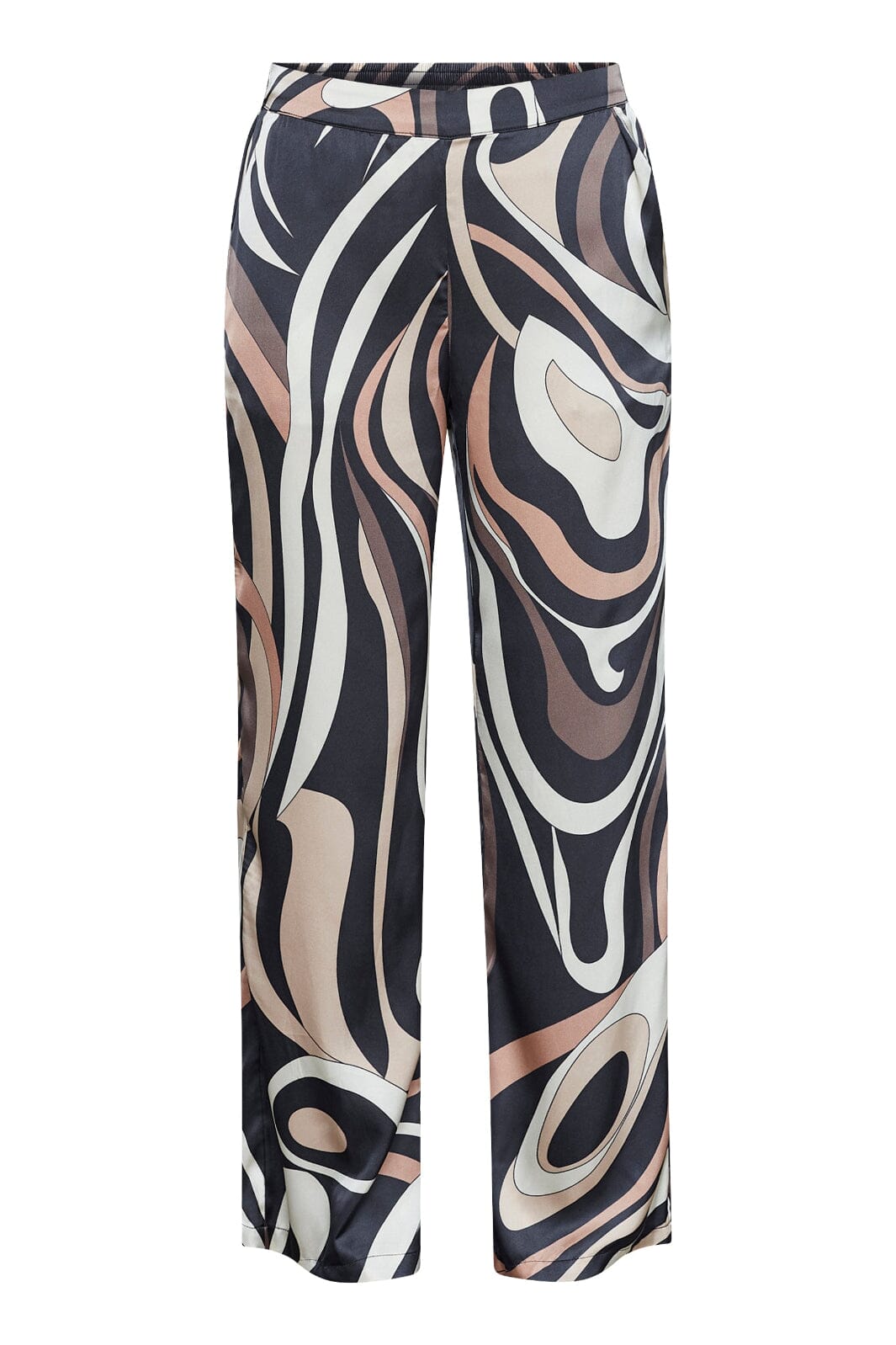 Byxor från Love & Divine med ett abstrakt grafiskt mönster i svart, vitt, beige och brunt. Byxorna har en lös passform och går till ankeln.