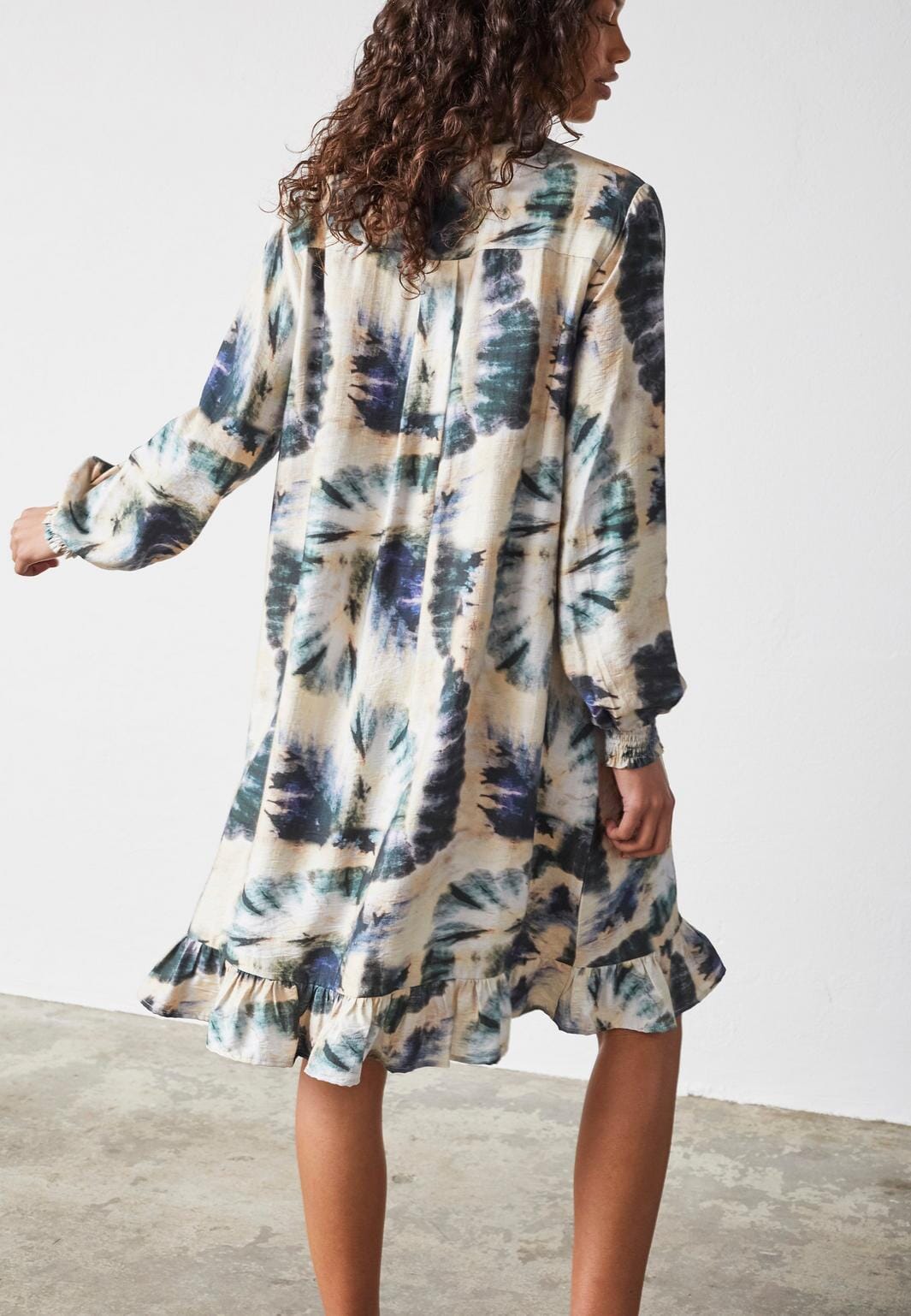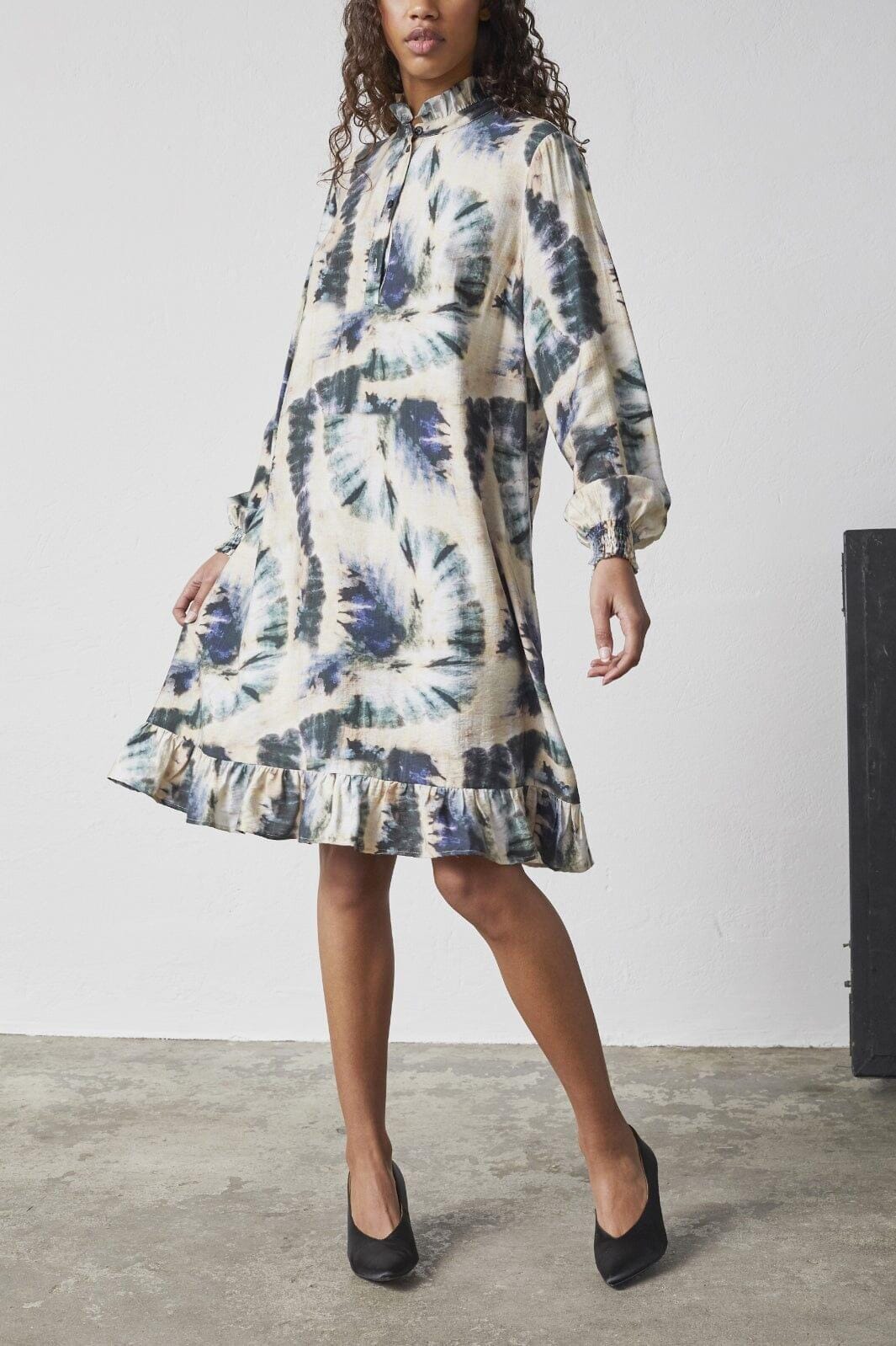 Klänning från Love & Divine med tie-dye mönster i beige, grön och blå nyanser. Den har hög hals, knapprad fram och en rynkad kant nertill. De långa ärmarna samlas vid handlederna.