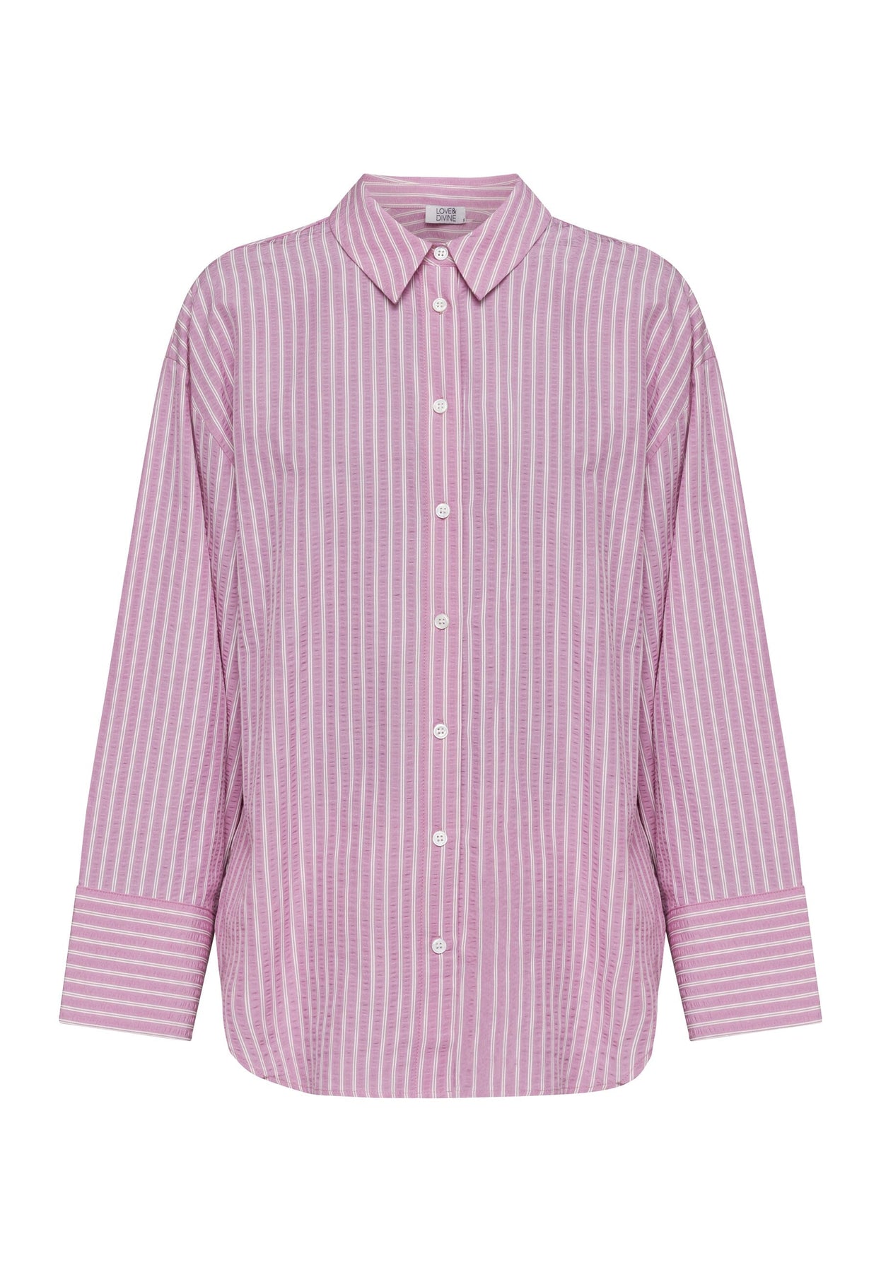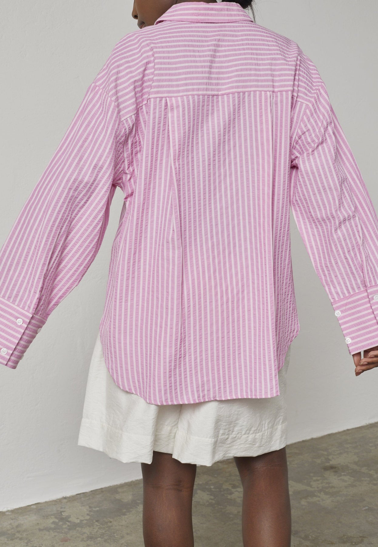 Rosa och vit randig skjorta med klassisk krage. Den lösa passformen ger god rörelsefrihet, och de långa ärmarna har manschetter vid handlederna.