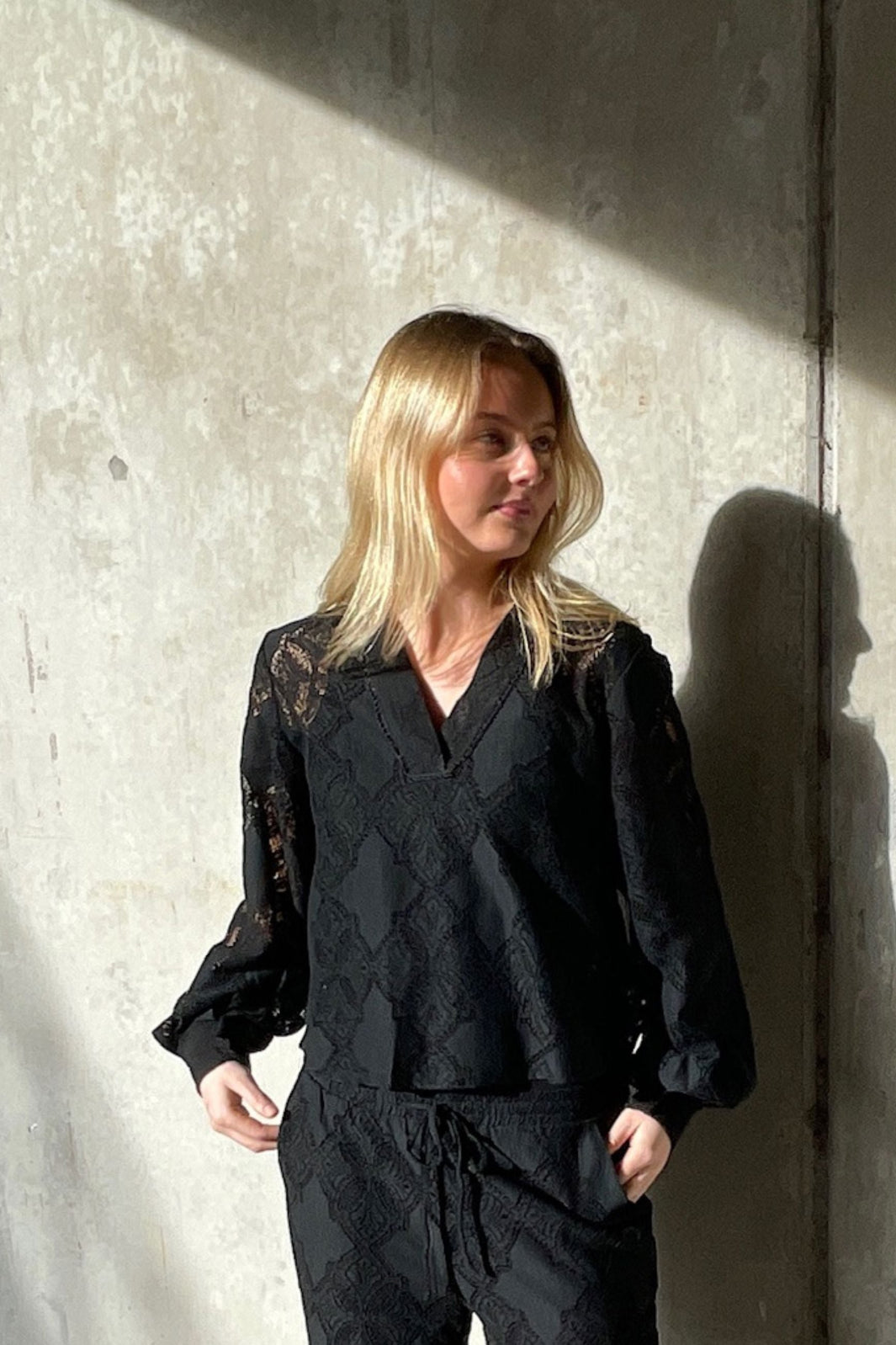 Svart blus från Love & Divine med genomgående spetsmönster. Blusen har en djup V-ringning och långa, lätt puffade ärmar med manschetter.