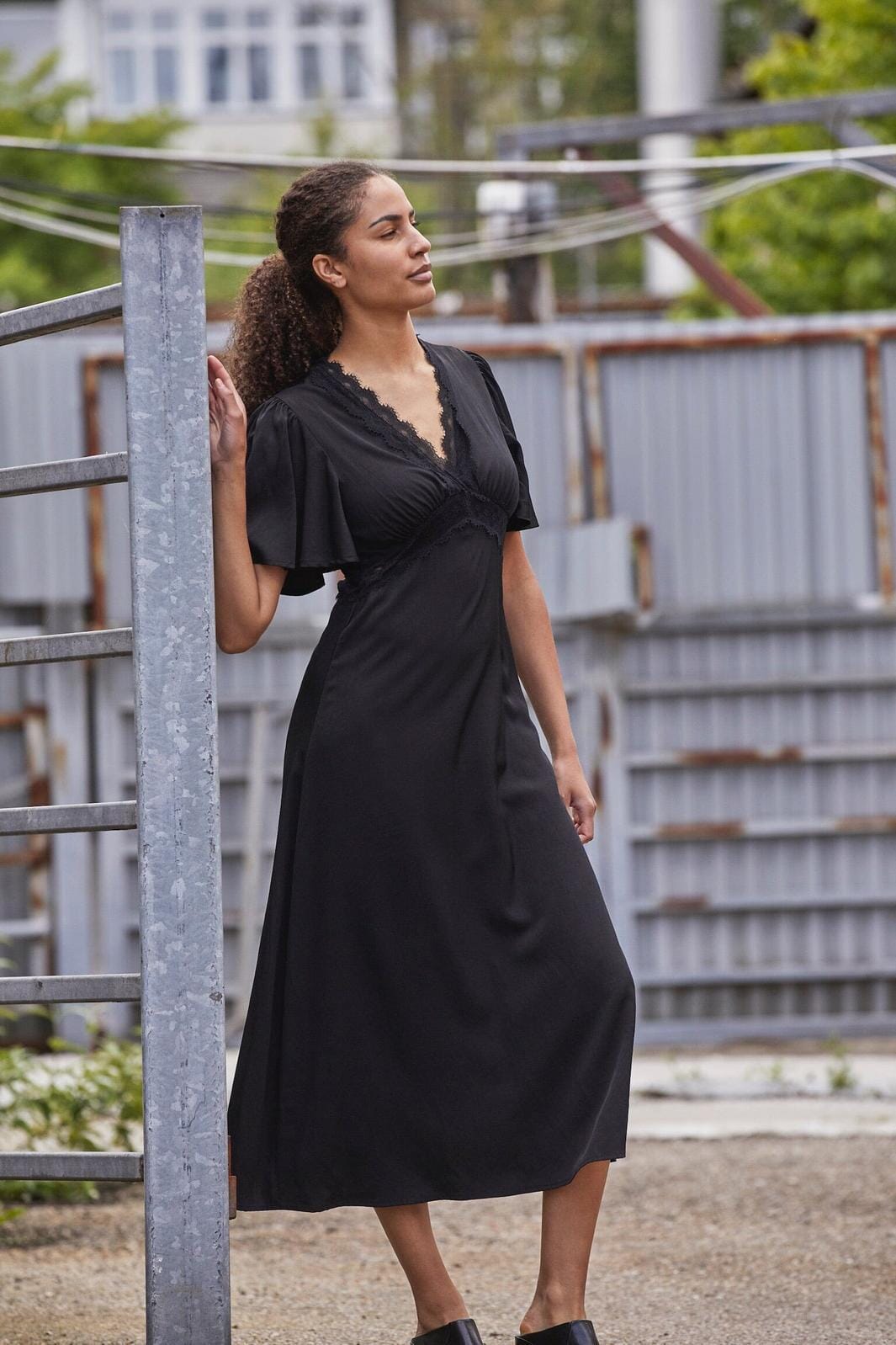 Svart maxiklänning från Love & Divine med V-ringning och spetsdetaljer. Klänningen har korta fladdermusärmar och är gjord i ett slätt material som faller mjukt längs kroppen.