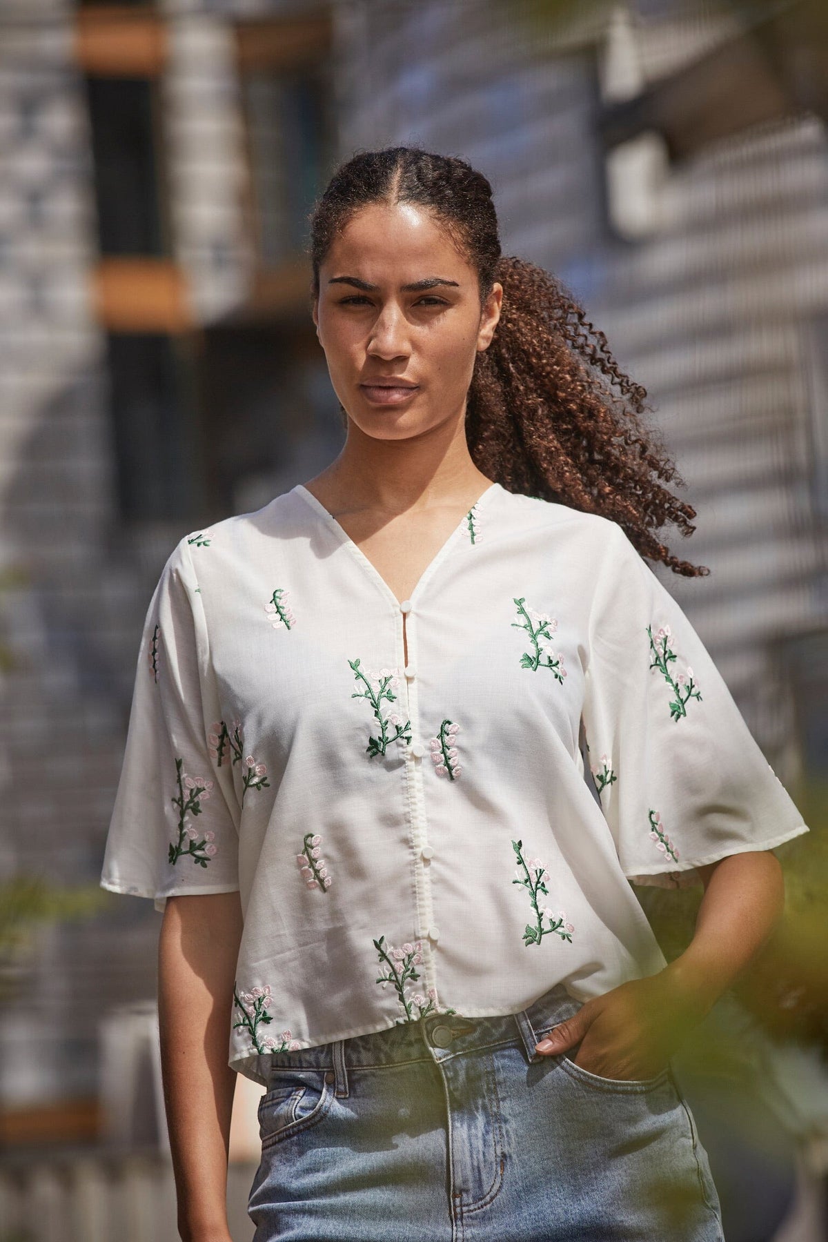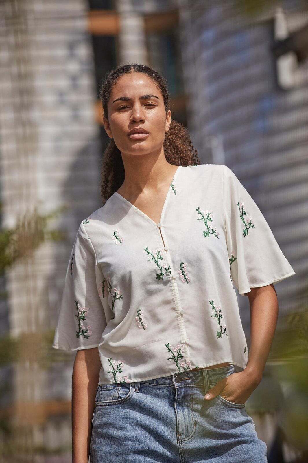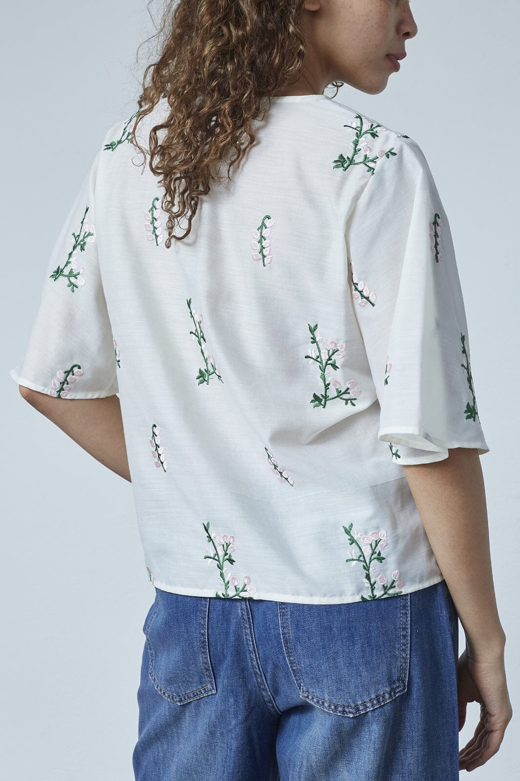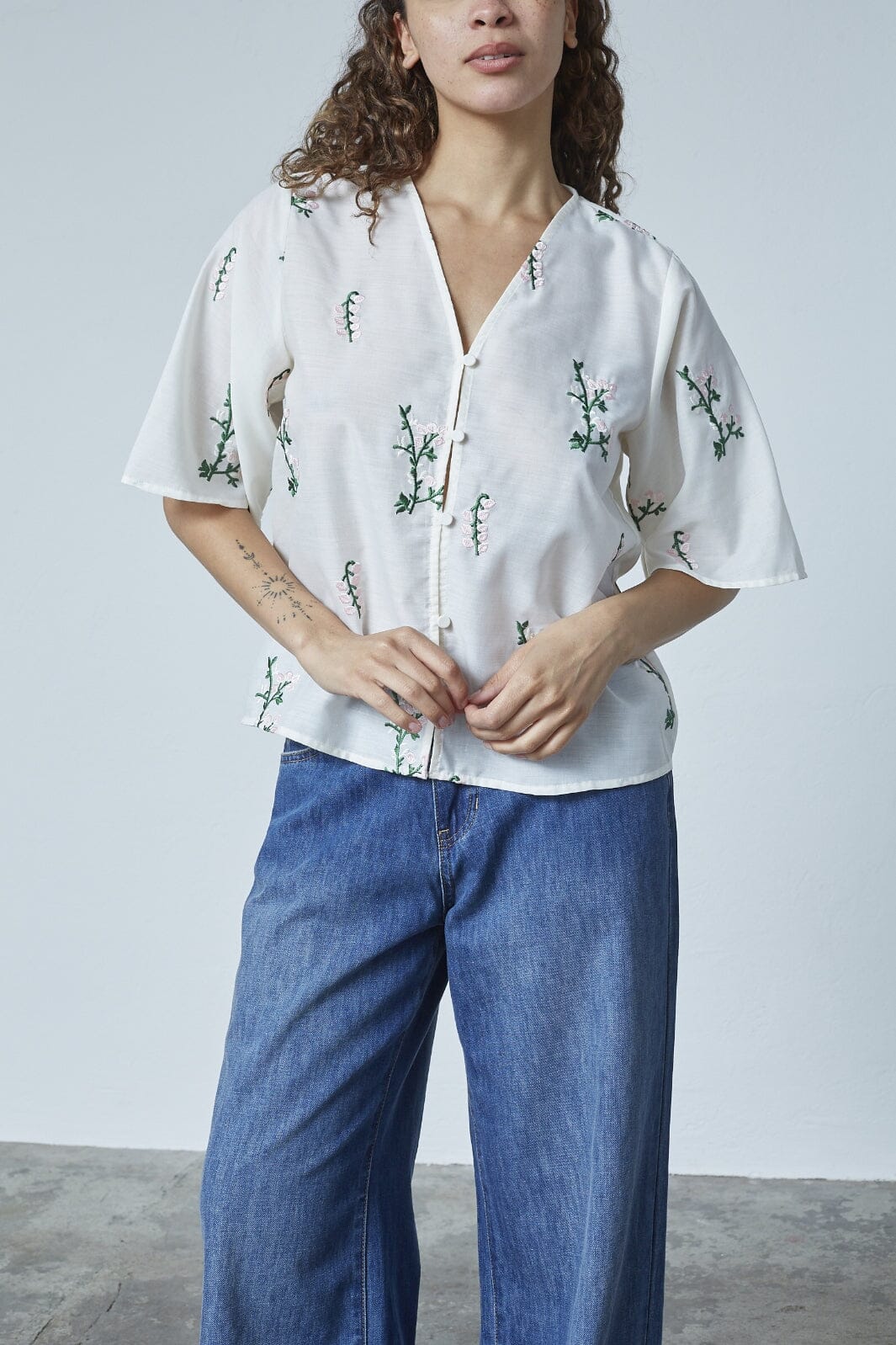 Krämfärgad blus från Love & Divine med broderade blommor i rosa och gröna stjälkar. Blusen har en v-ringad hals, knappstängning fram och breda, korta ärmar.