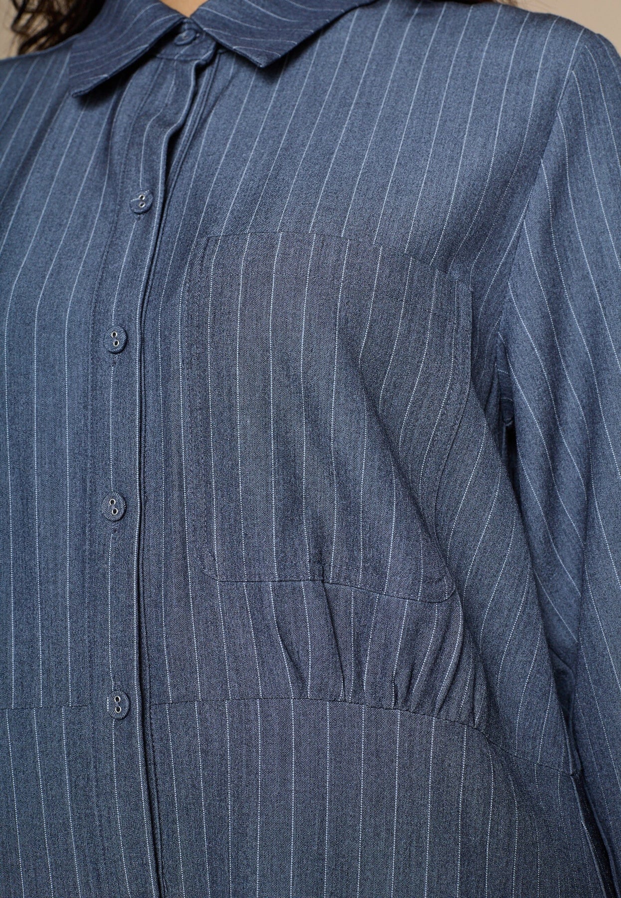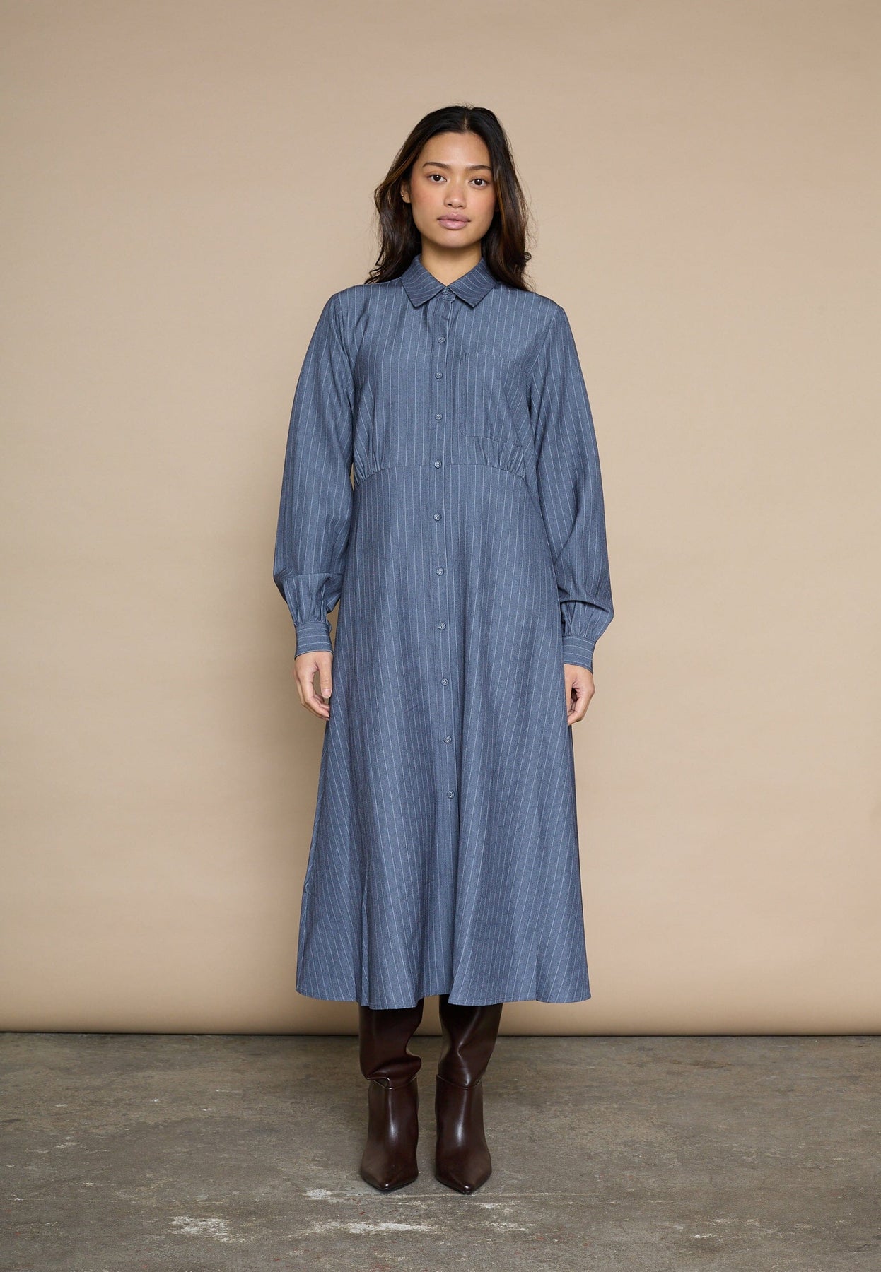 Skjortklänning från Love & Divine med diskreta ränder i blå nyanser. Klänningen har en klassisk skjortkrage och en genomgående knäppning framtill.