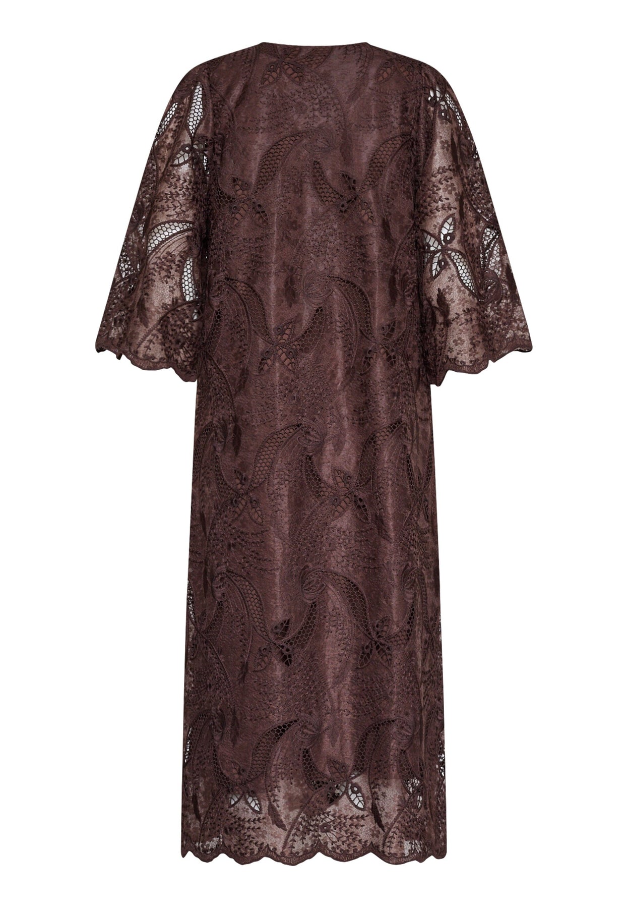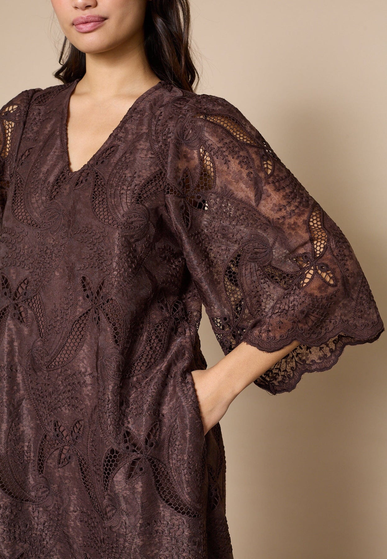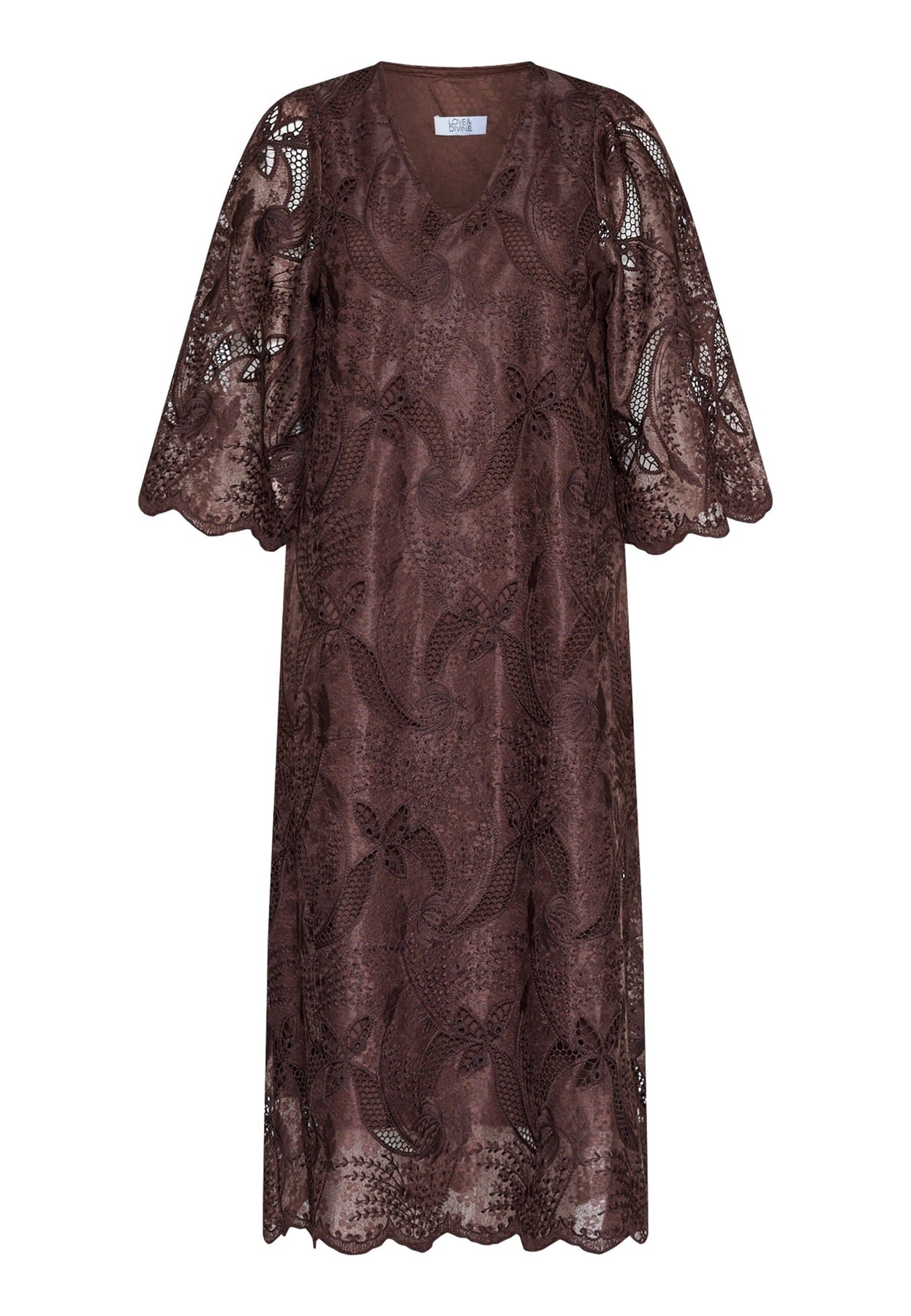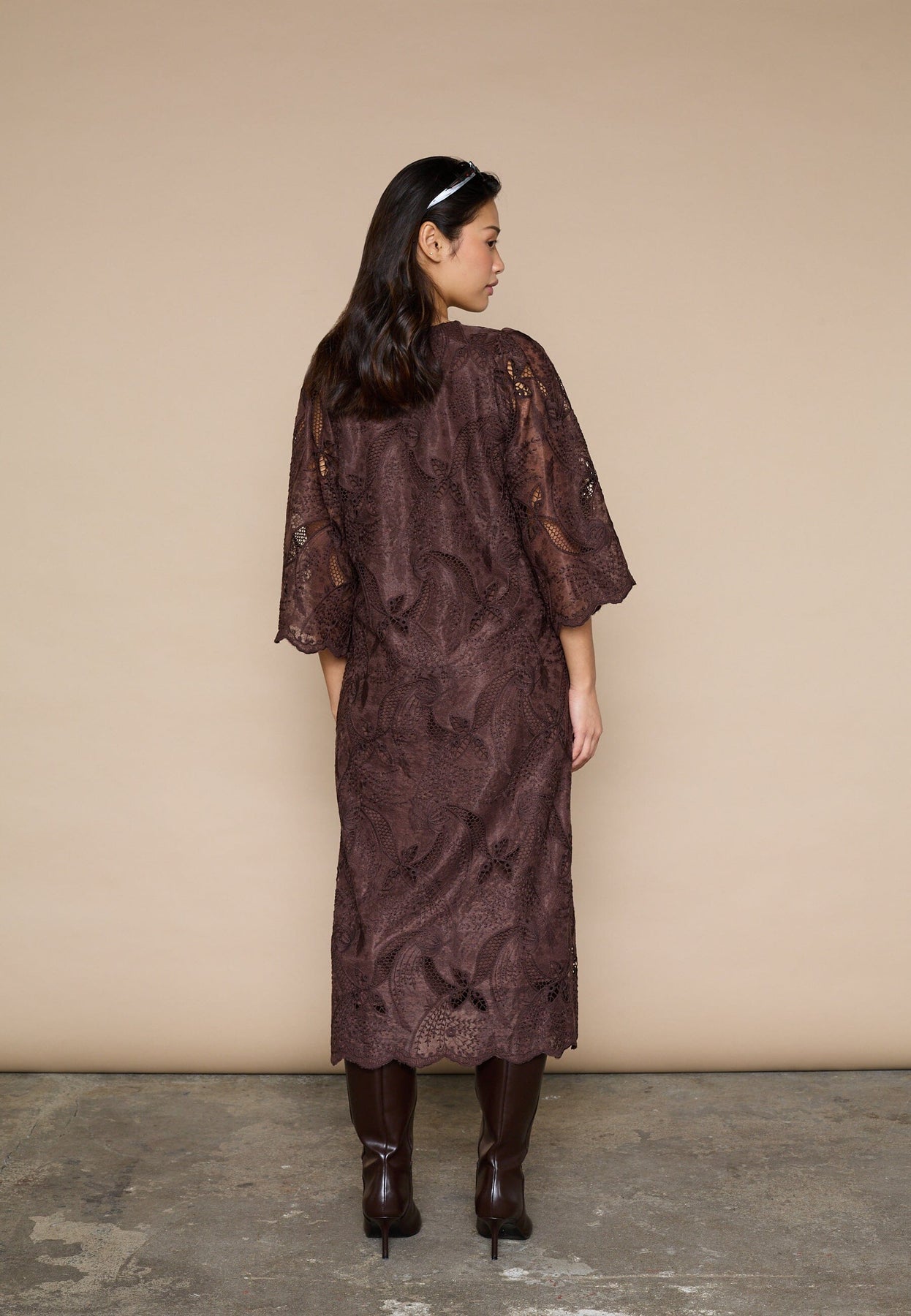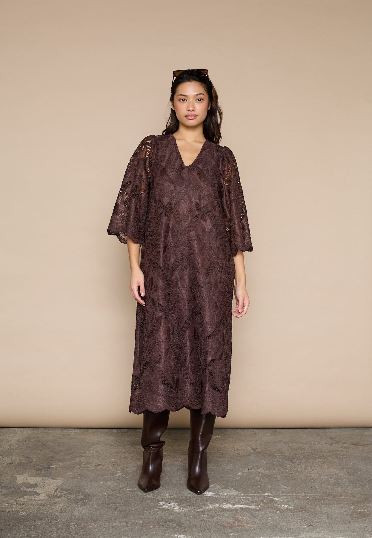 Brun klänning från Love & Divine med broderi och spets. Klänningen har trekvartsärmar, V-ringning och ett blommigt paisleymönster.