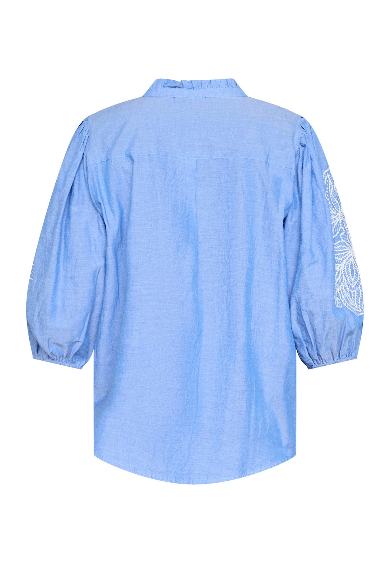 Blå skjorta från Love & Divine med vita blombroderier. Skjortan är gjord av 100 % bomull och har en lös passform med 3/4-ärmar med puff.