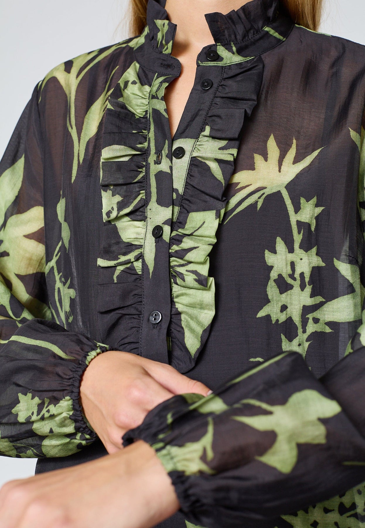 - Långa ärmar med rynk