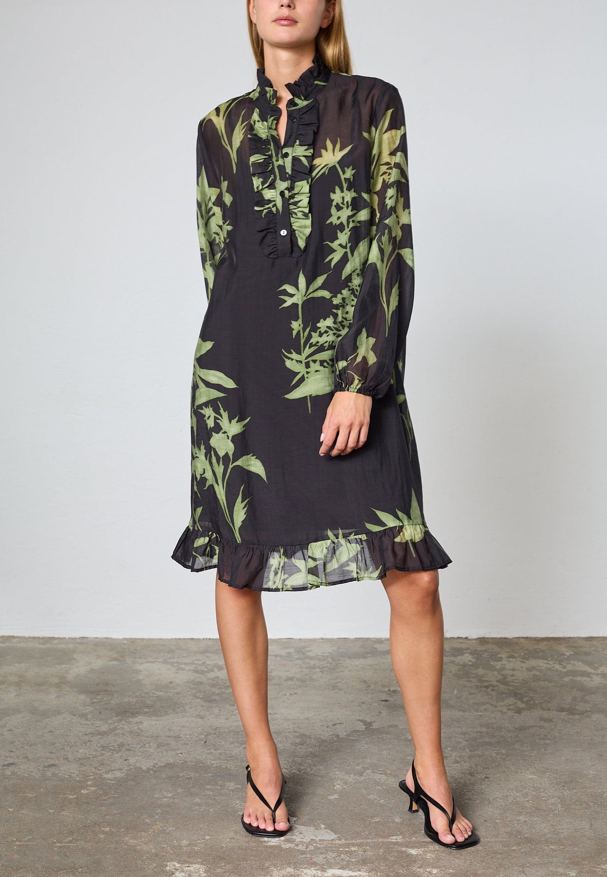 Knälång klänning från Love & Divine med grönt bladmotiv på mörk bakgrund. Klänningen har en liten stående krage med volanger och stängs med knappar.