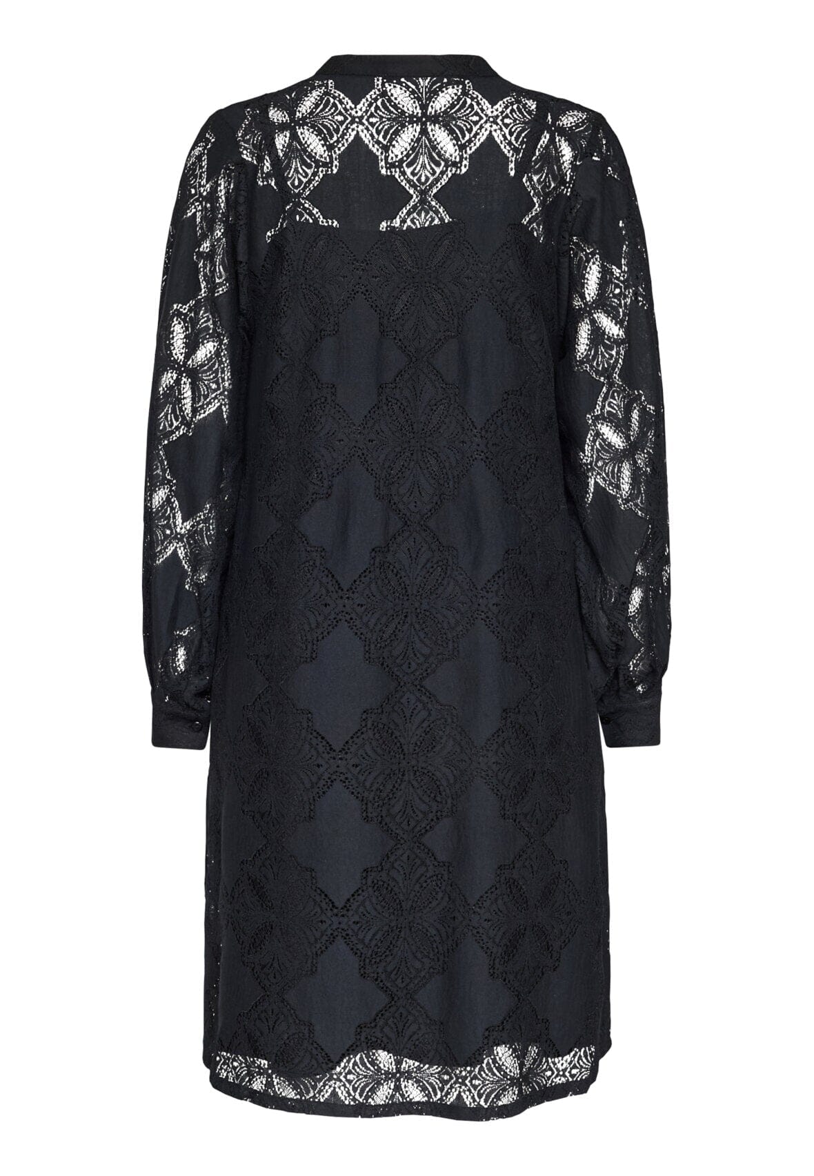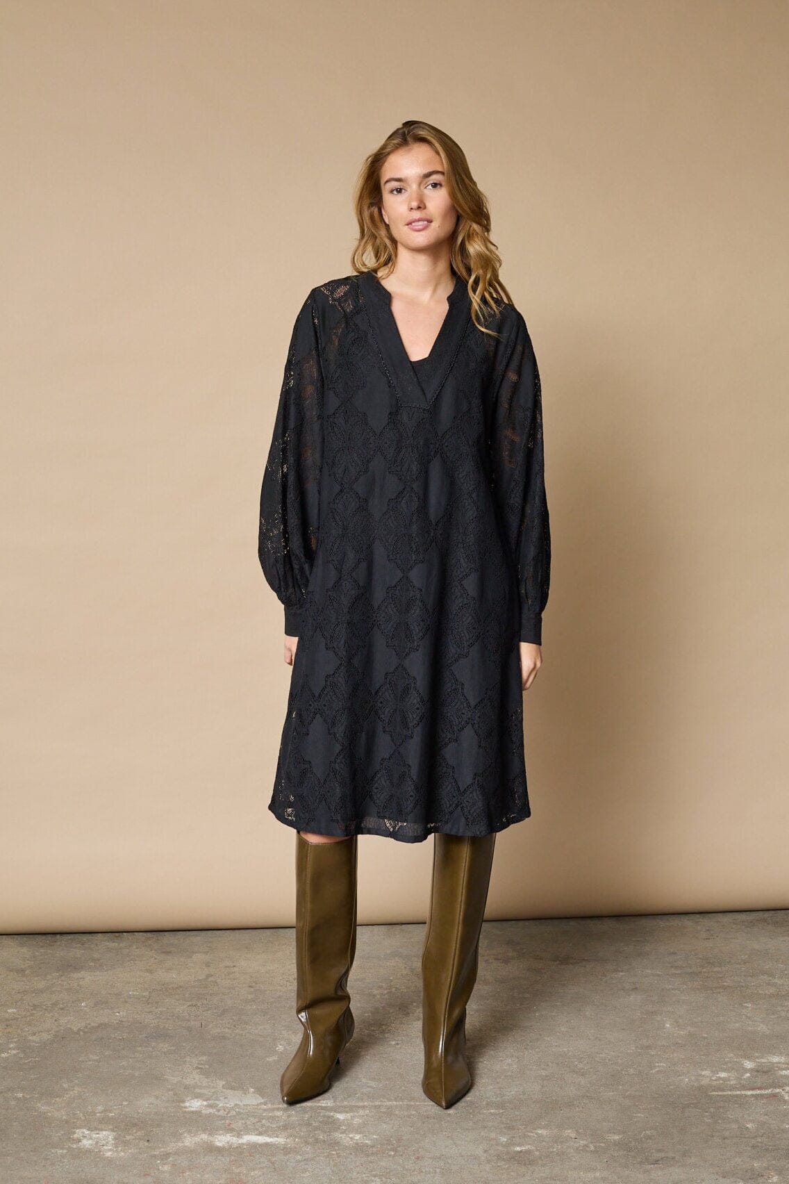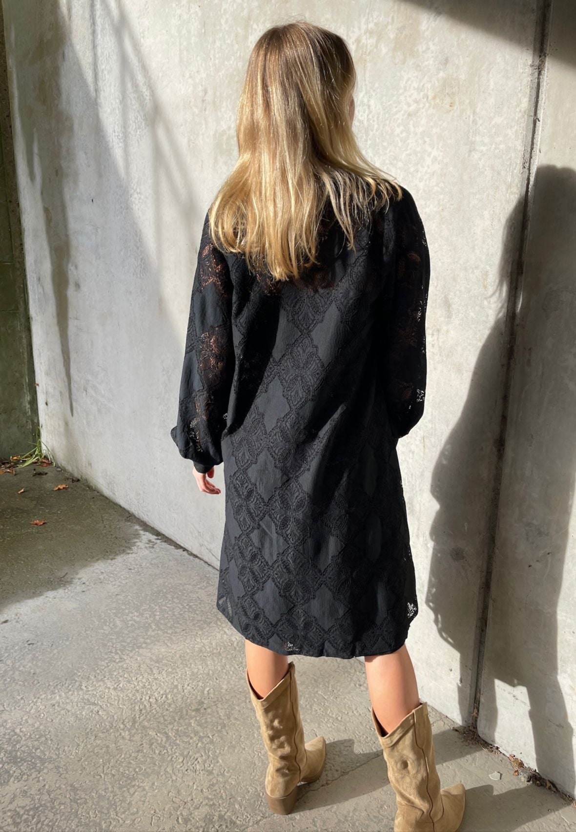 Svart klänning från Love & Divine med broderier och spetsdetaljer i tyget. Klänningen har knälång längd och en lös passform, och den passar både till vardagliga, festliga och formella tillfällen.