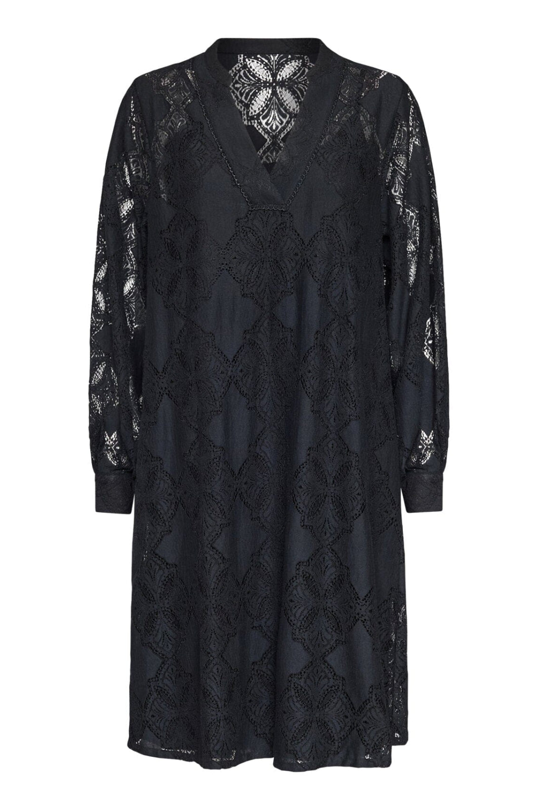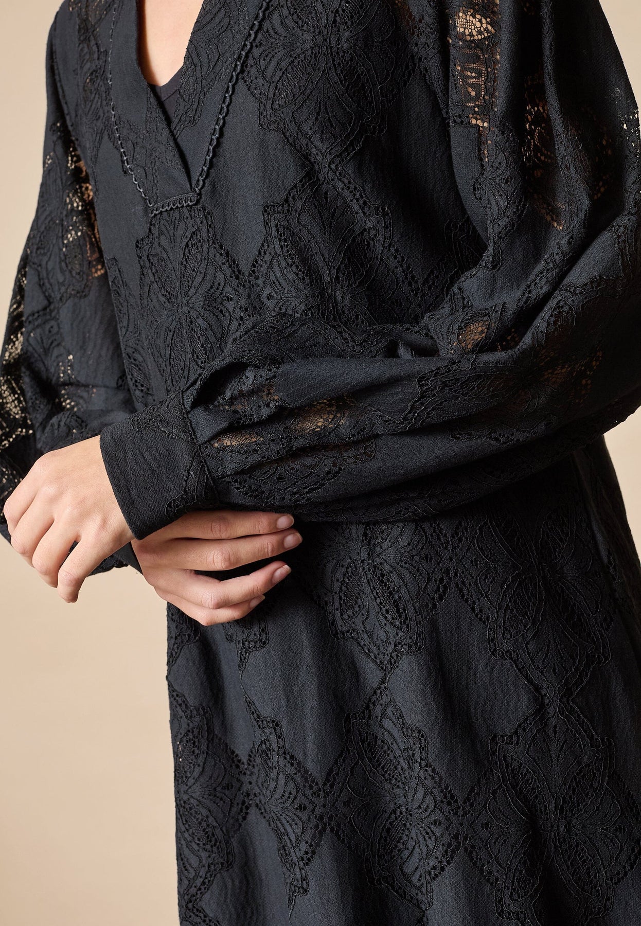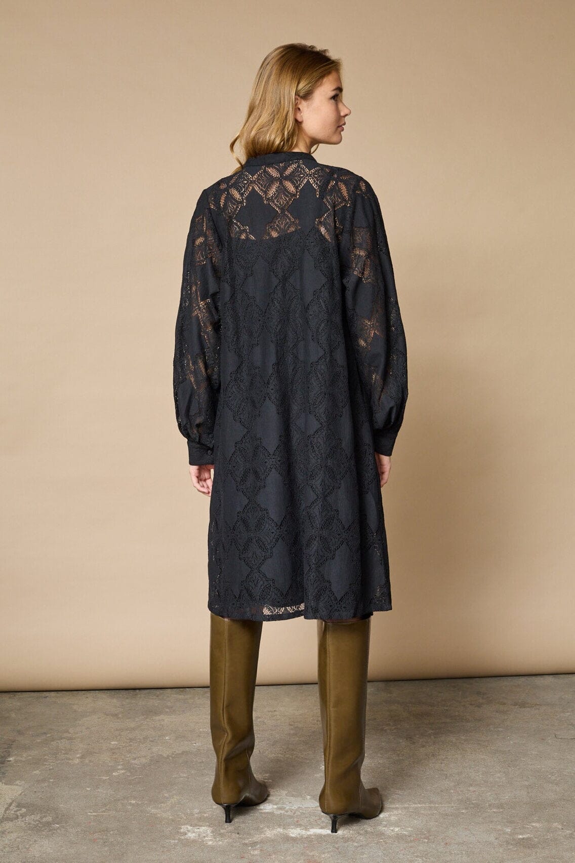 Svart klänning från Love & Divine med broderier och spetsdetaljer i tyget. Klänningen har knälång längd och en lös passform, och den passar både till vardagliga, festliga och formella tillfällen.