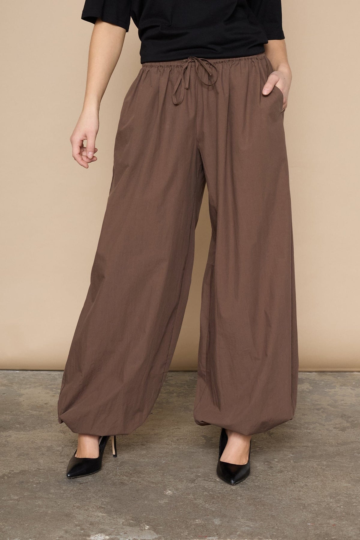 Mörkbruna byxor från Love & Divine, tillverkade av bomull. Byxorna har vida ben och en lös passform med resår och dragsko i midjan.