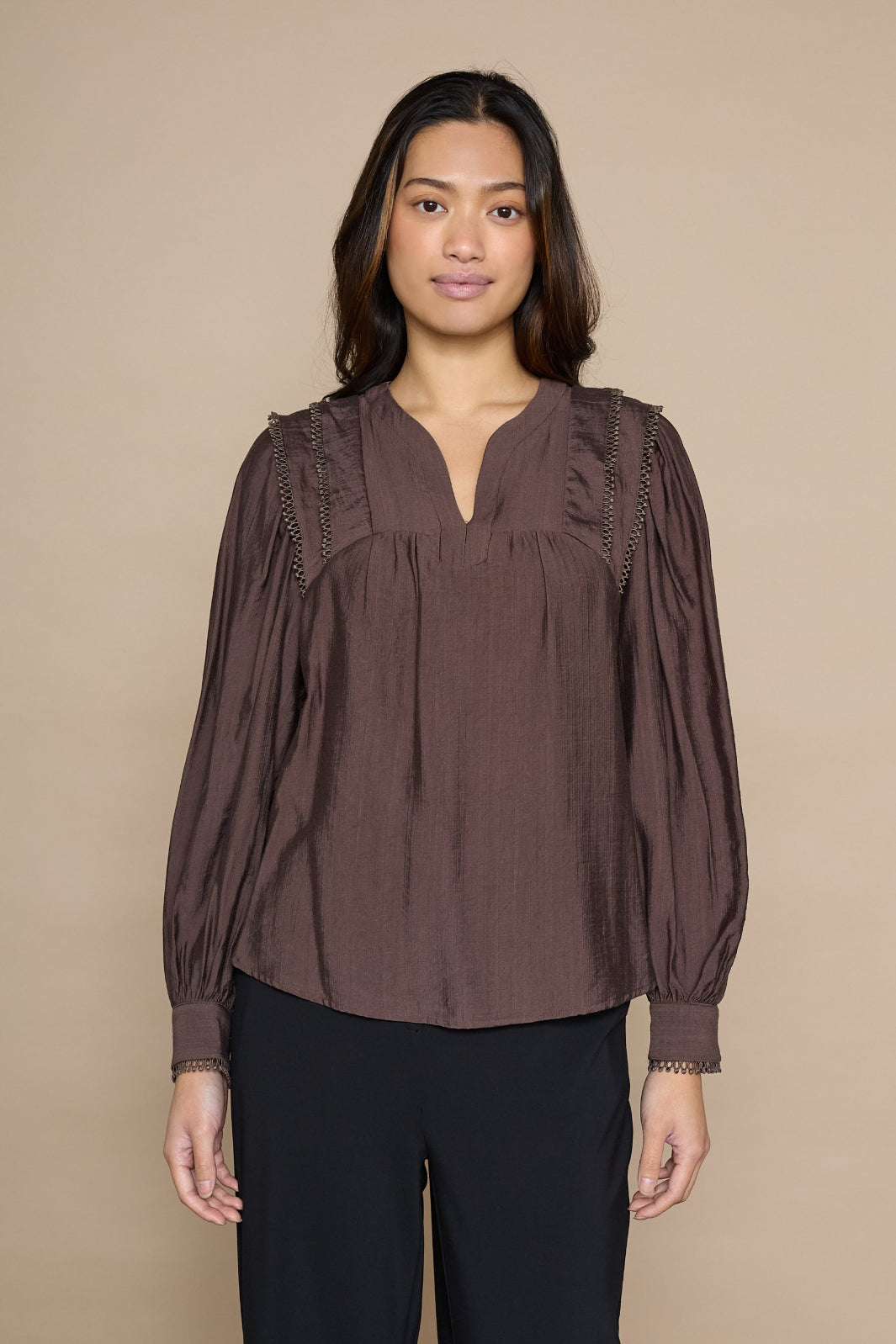Skjorta från Love & Divine i creme med genomskinlig spets och blommönster. Den har hög krage med volangkant och stängs med knappar.