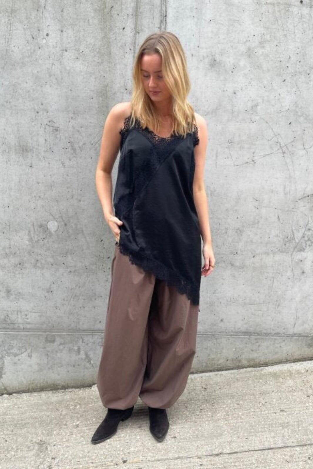 Svart topp från Love & Divine med spetsdetaljer längs halsringningen och en asymmetrisk spetskant nedtill. Toppen har tunna axelband och V-ringning.