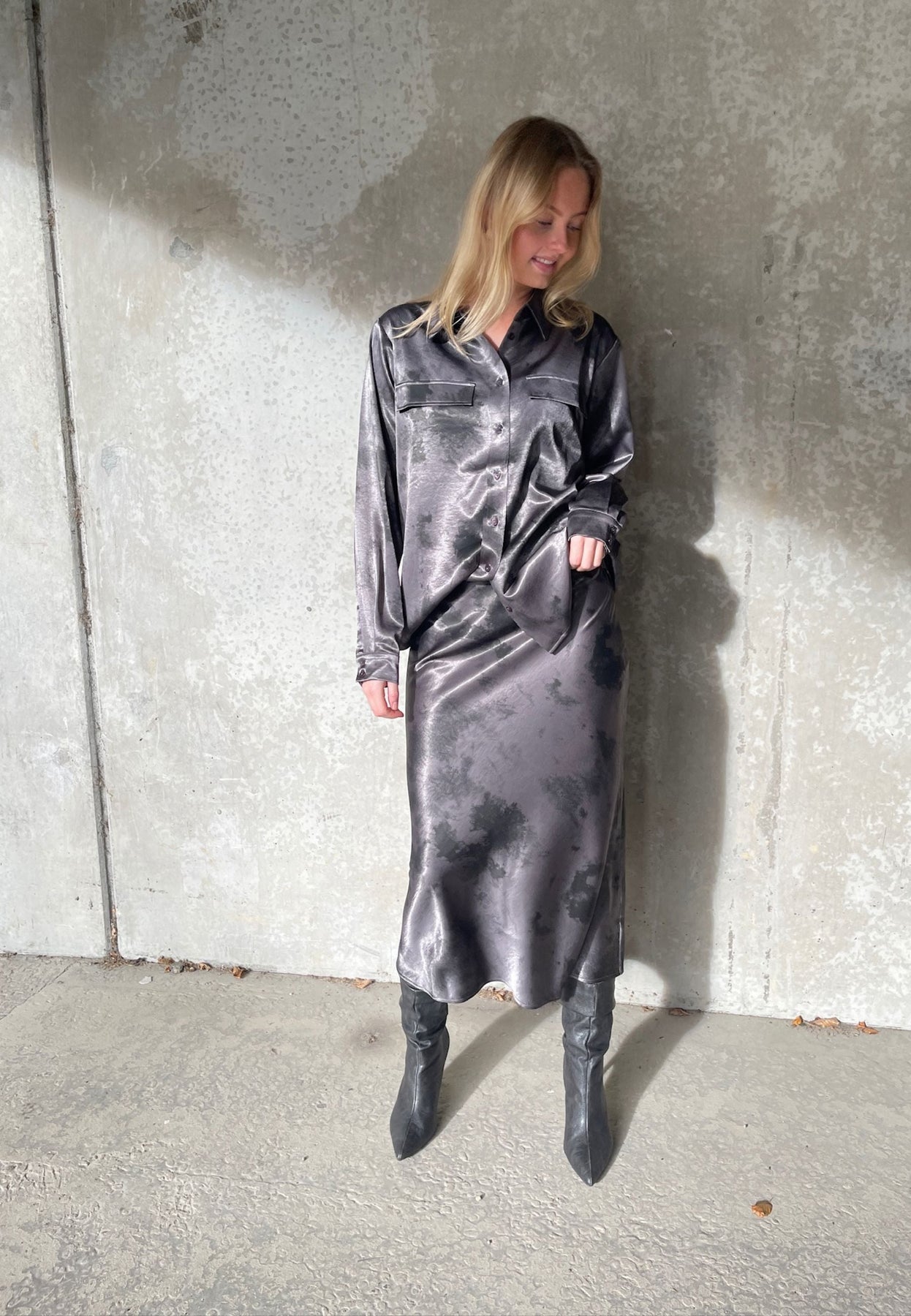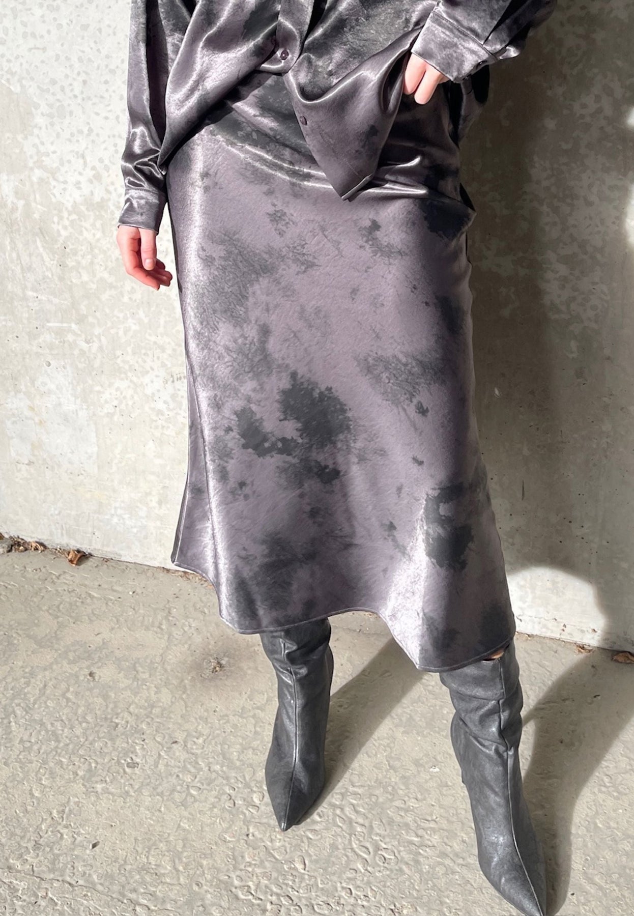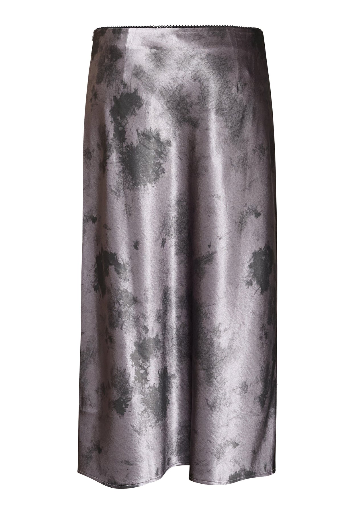 Kjol från Love & Divine i grå och silvernyanser med ett marmorerat acid wash-mönster i glänsande polyester.