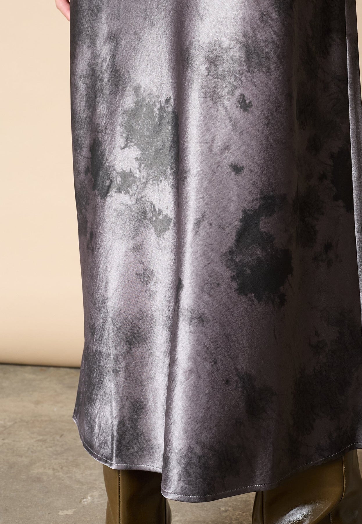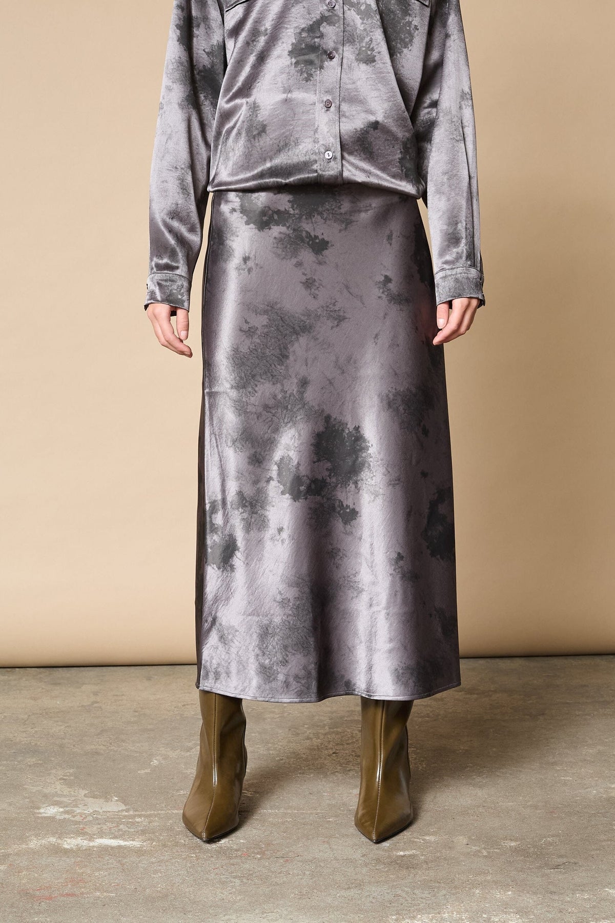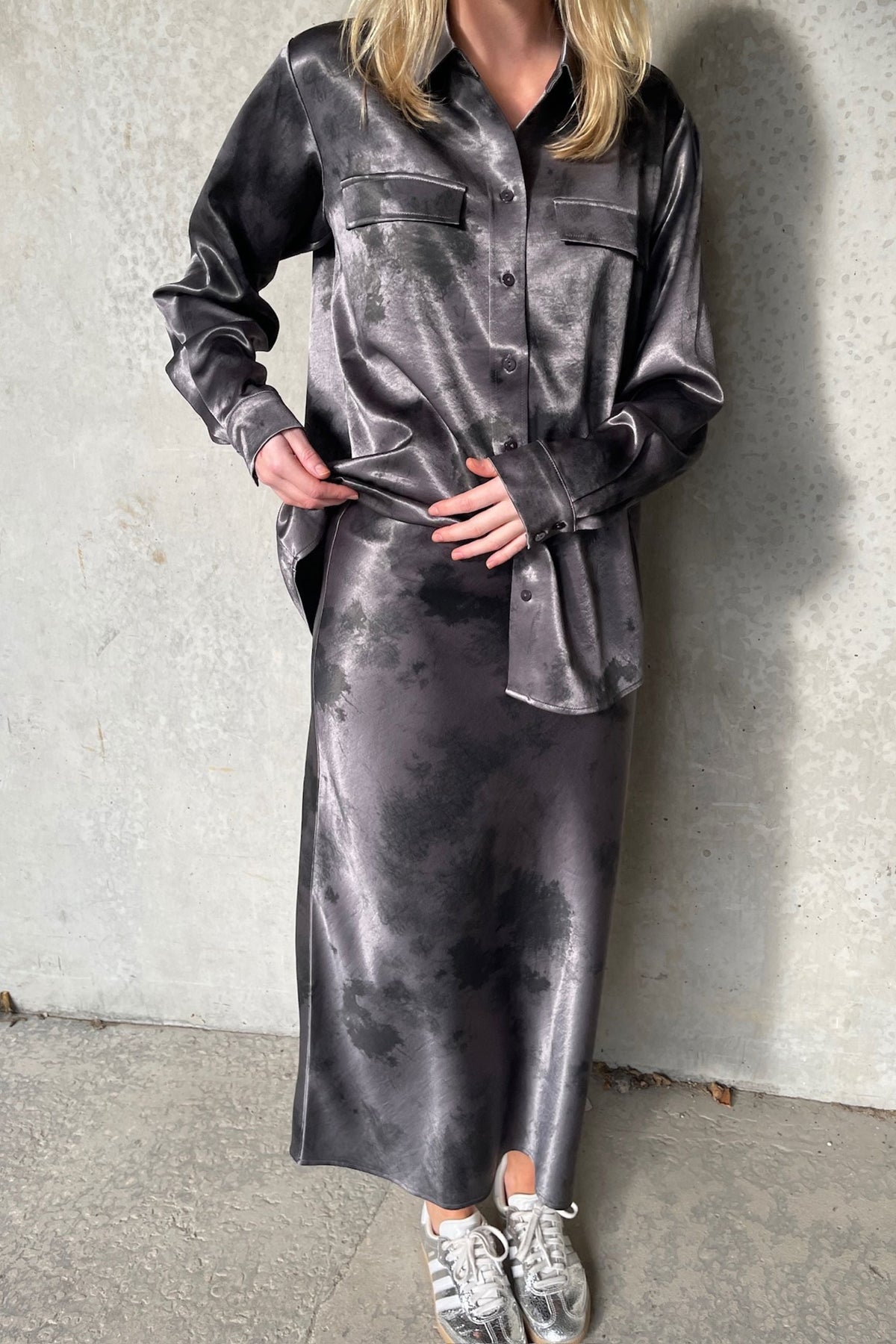Kjol från Love & Divine i grå och silvernyanser med ett marmorerat acid wash-mönster i glänsande polyester.
